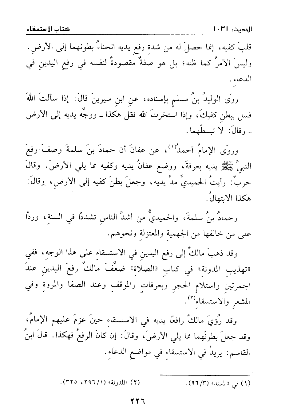 ففي ((تهذيب المدونة)) في ((كتاب الصَّلاة)) : ضعف مالك رفع اليدين عد الجمرتين، واستلام الحجر، وبعرفات، والموافق، وعند الصفا والمروة، وفي المشعر، ووالاستسقاء، وقد رئي مالك رافعا يديه في الاستقاء، حين عزم عليهم الإمام، وقد جعل بطونهما مما يلي الأرض، وقال إن كانَ الرفع فهكذا.