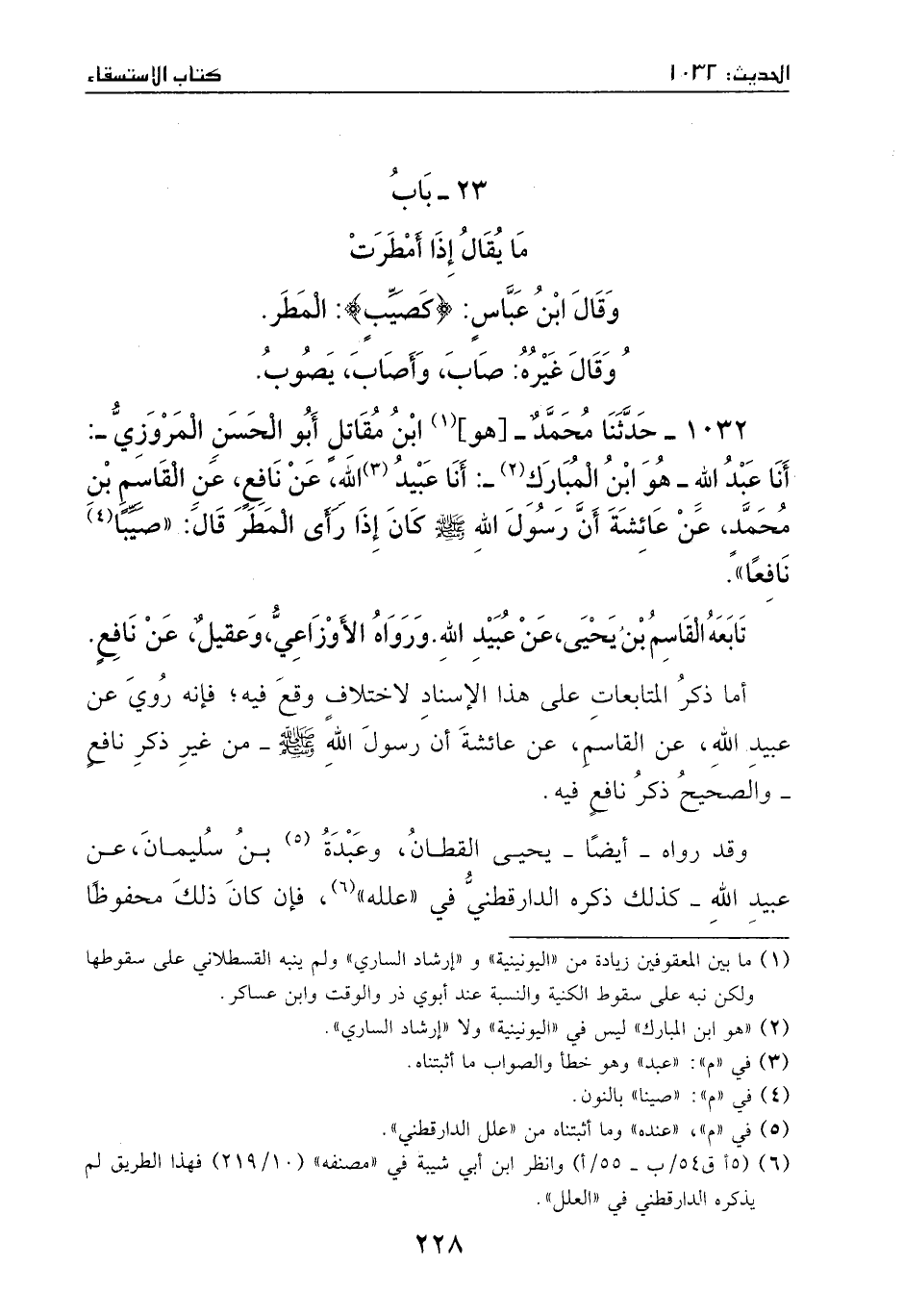 1032 - حدثنا محمد بن مقتل أبو الحسن المروزني: أنا عبد الله - هوَ: ابن المبارك -: أنا عبيد الله، عن نافع، عن القاسم بن محمد، عن عائشة، أن رسول الله - صَلَّى اللهُ عَلَيْهِ وَسَلَّمَ - كانَ إذا رأى المطر قالَ: ((صيبا نافعا)) .