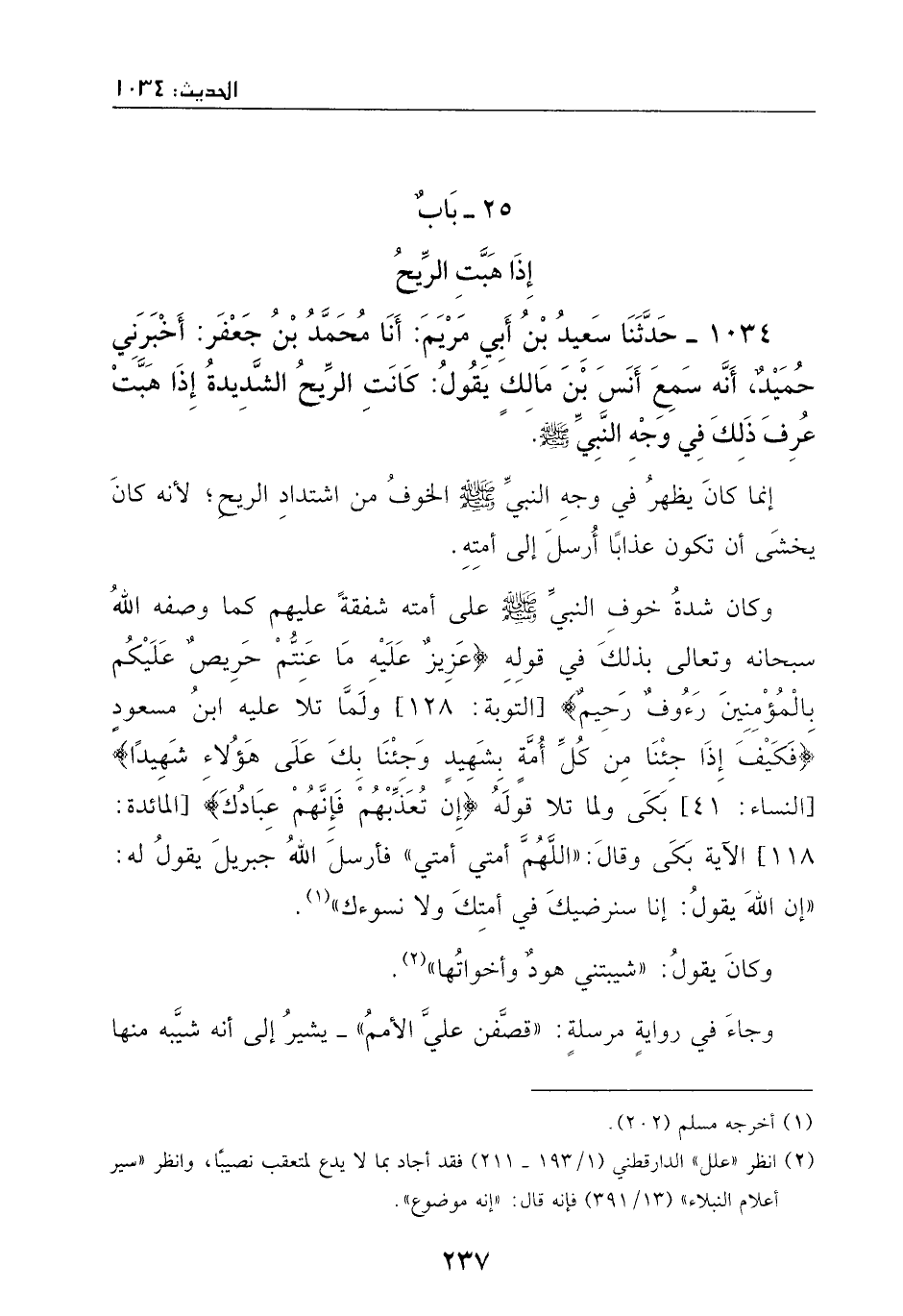 1034 - حديثا سعيد بن أبي مريم: أنا محمد بن جعفر: أخبرني حميد، أنه سمع أنس بن مالك يقول: كانت الريح الشديدة إذا هبت عرف ذَلِكَ في وجه النَّبيّ - صَلَّى اللهُ عَلَيْهِ وَسَلَّمَ -.