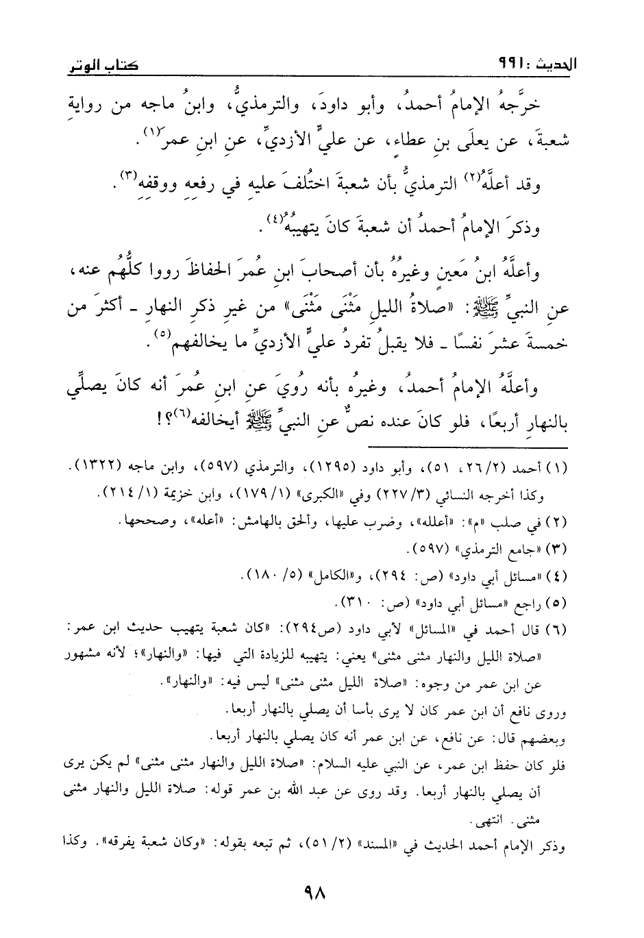 وأعله الإمام أحمد وغيره بأنه روي عن ابن عمر، أنه كان يصلي بالنهار أربعاً، فلو كان عنده نص عن النبي - صَلَّى اللهُ عَلَيْهِ وَسَلَّمَ - لم يخالفه.