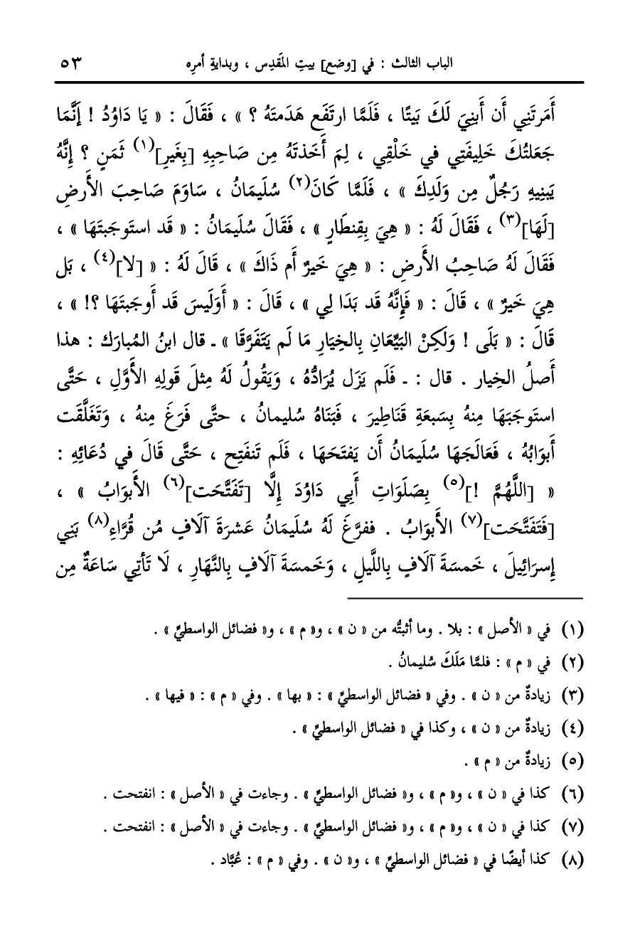 قال: ـ فَلَم يَزَل يُرَادُّهُ، وَيَقُولُ لَهُ مِثلَ قَولِهِ الأَوَّلِ، حَتَّى استَوجَبَهَا مِنهُ بِسَبعَةِ قَنَاطِيرَ، فَبَنَاهُ سُليمانُ، حتَّى فَرَغَ مِنهُ، وَتَغَلَّقَت أَبوَابُهُ، فَعَالَجَهَا سُلَيمَانُ أَن يَفتَحَهَا، فَلَم تَنفَتِح، حَتَّى قَالَ في دُعَائِهِ: «[اللَّهُمَّ!] (¬٥) بِصَلَوَاتِ أَبِي دَاوُدَ إِلَّا [تَفَتَّحَت] (¬٦) الأَبوَابُ»، [فَتَفَتَّحَت] (٦) الأَبوَابُ. ففرَّغَ لَهُ سُلَيمَانُ عَشرَةَ آلَافٍ مُن قُرَّاءِ (¬٧) بَنِي إِسرَائِيلَ، خَمسَةَ آلَافٍ بِاللَّيلِ، وَخَمسَةَ آلَافٍ بِالنَّهَارِ، لَا تَأتِي سَاعَةٌ مِن