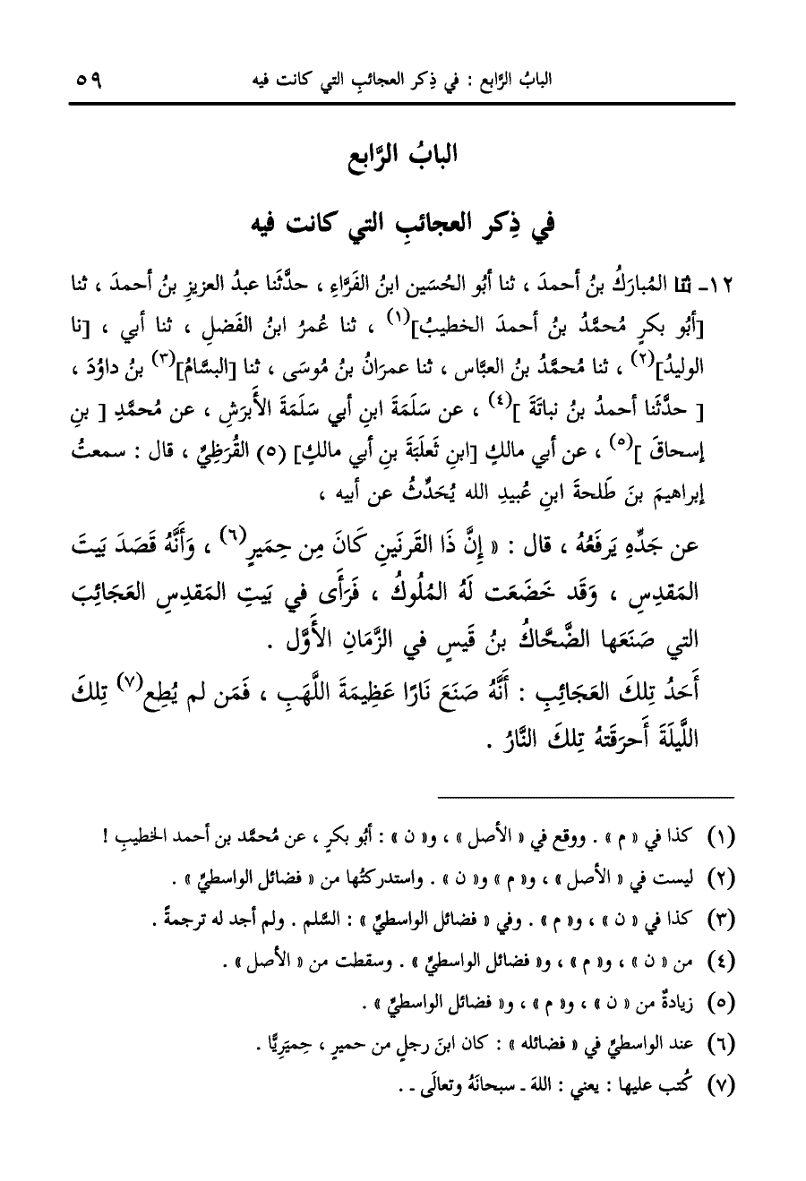 عن جَدِّهِ يَرفَعُهُ، قال: «إِنَّ ذَا القَرنَينِ كَانَ مِن حِمَيرٍ (¬٦)، وَأَنَّهُ قَصَدَ بَيتَ المَقدِسِ، وَقَد خَضَعَت لَهُ المُلُوكُ، فَرَأَى في بَيتِ المَقدِسِ العَجَائِبَ التي صَنَعَها الضَّحَّاكُ بنُ قَيسٍ في الزَّمَانِ الأَوَّل.