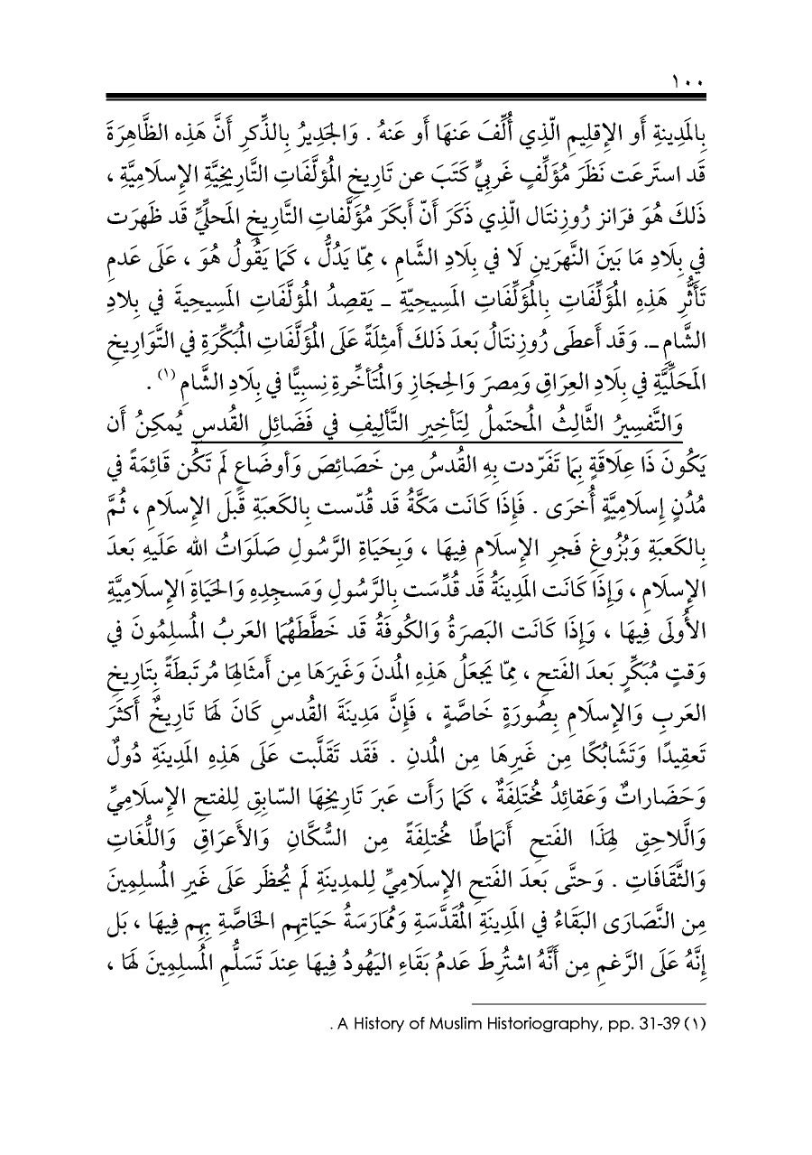 بِالمَدِينةِ أَو الإِقلِيمِ الّذِي أُلِّفَ عَنهَا أَو عَنهُ. وَالجَدِيرُ بِالذِّكرِ أَنَّ هَذِه الظَّاهِرَةَ قَد استَرعَت نَظَرَ مُؤَلِّفٍ غَربِيٍّ كَتَبَ عن تَارِيخِ المُؤلَّفَاتِ التَّارِيخِيَّةِ الإِسلَامِيَّةِ، ذَلكَ هُوَ فرَانز رُوزِنتَال الّذِي ذَكَرَ أَنّ أَبكَرَ مُؤَلَّفاتِ التَّارِيخِ المَحلِّيِّ قَد ظَهرَت في بِلَادِ مَا بَينَ النَّهرَينِ لَا في بِلَادِ الشَّامِ، مِمّا يَدُلُّ، كَمَا يَقُولُ هُوَ، عَلَى عَدمِ تَأَثُّرِ هَذِهِ المُؤَلِّفَاتِ بِالمُؤَلِّفَاتِ المَسِيحِيّةِ ـ يَقصِدُ المُؤلَّفَاتِ المَسِيحِيةَ في بِلادِ الشَّامِ ـ. وَقَد أَعطَى رُوزِنتَالُ بَعدَ ذَلكَ أَمثِلَةً عَلَى المُؤَلَّفَاتِ المُبَكِّرَةِ في التَّوَارِيخِ المَحَلِّيَّةِ في بِلَادِ العِرَاقِ وَمِصرَ وَالحِجَازِ وَالمُتَأخِّرةِ نِسبِيًّا في بِلَادِ الشَّامِ (¬١).