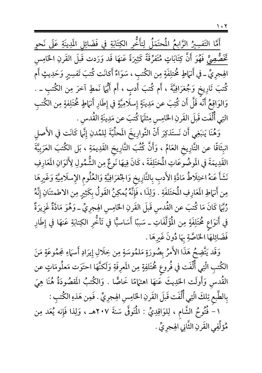 أَمَّا التَفسِيرُ الرَّابِعُ المُحتَمَلُ لِتأَخُّرِ الكِتَابَةِ في فَضَائِلِ المَدِينَةِ عَلَى نَحوٍ تَخَصُّصِيٍّ فَهُوَ أَنَّ كِتَابَاتٍ مُتَفرِّقَةً كَثِيرَةً عَنهَا قَد وَرَدت قَبلَ القَرنِ الخَامِسِ الهِجرِيِّ ـ في أَنمَاطٍ مُختلِفَةٍ مِن الكُتبِ، سَوَاءٌ أَكانَت كُتبَ تَفسِيرٍ وَحَدِيثٍ أَم كُتبَ تَارِيخٍ وَجُغرَافِيَّةَ، أَم كُتبَ أَدبٍ، أَم أَيُّمَا نَمطٍ آخرَ مِن الكُتبِ ـ. وَالوَاقِعُ أَنّه قَلَّ أَن كُتِبَ عن مَدِينَةٍ إِسلَامِيَّةٍ في إِطَارِ أَنمَاطٍ مُختَلِفةٍ مِن الكُتبِ التِي أُلِّفَت قَبلَ القَرنِ الخَامِسِ مِثلَمَا كُتبَ عن مَدِينَةِ القُدسِ.