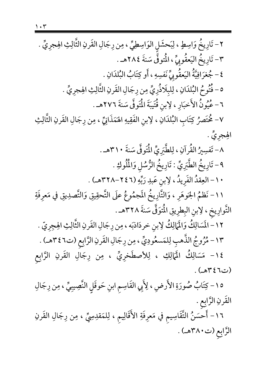١٦ - أَحسَنُ التَّقَاسِيمِ في مَعرِفَةِ الأَقَالِيمِ، لِلمَقدِسِيِّ، مِن رِجَالِ القَرنِ الرَّابِعِ (ت ٣٨٠ هـ).