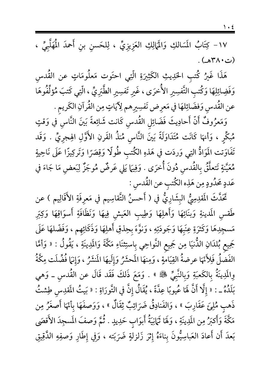 ١٧ - كِتَابُ المَسَالكِ وَالمَمَالِكِ العَزِيزِيِّ، لِلحَسنِ بنِ أَحمدَ المُهَلَّبِيِّ، (ت ٣٨٠ هـ).