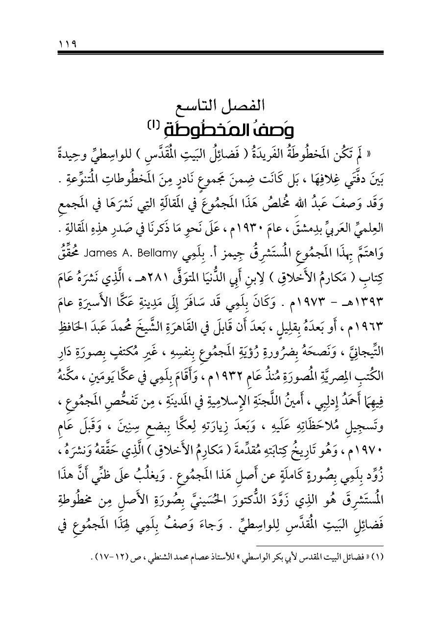 «لَم تَكُن المَخطُوطَةُ الفَريدَةُ (فَضائِلُ البَيتِ المُقَدَّسِ) للواسِطيِّ وحِيدةً بَينَ دفَّتَي غِلافِهَا، بَل كَانَت ضِمنَ مَجموعٍ نَادرٍ مِنَ المَخطُوطاتِ المُتنوِّعةِ. وَقَد وَصفَ عَبدُ اللهِ مُخلصُ هَذَا المَجمُوعَ في المَقالَةِ التِي نَشرَهَا في المَجمعِ العِلميِّ العَربيِّ بدِمشقَ، عامَ ١٩٣٠ م، عَلَى نَحوِ مَا ذَكرنَا في صَدرِ هذِهِ المَقالةِ. وَاهتَمَّ بِهذَا المَجمُوعِ المُستَشرِقُ جِيمز أ. بِلَمِي James A. Bellamy مُحقِّقُ كِتابِ (مَكارمُ الأَخلاقِ) لِابنِ أَبِي الدُّنيَا المتوَفَّى ٢٨١ هـ، الَّذِي نَشرَهُ عَامَ ١٣٩٣ هـ - ١٩٧٣ م. وَكَانَ بِلَمِي قَد سَافَرَ إِلَى مَدِينةِ عَكَّا الأَسيرَةِ عامَ ١٩٦٣ م، أَو بَعدَهُ بِقلِيلٍ، بَعدَ أَن قَابلَ في القَاهرَةِ الشَّيخَ مُحمدَ عَبدَ الحَافظِ التِّيجانِيَّ، وَنَصحَهُ بِضرُورةِ رُؤيَةِ المَجمُوعِ بِنفسِهِ، غَيرِ مُكتفٍ بِصورَةِ دَارِ الكُتبِ المِصريَّةِ المُصورَةِ مُنذُ عَامِ ١٩٣٢ م، وَأَقَامَ بِلَمِي في عكَّا يَومَينِ، مكَّنهُ فِيهِمَا أَحمَدُ إِدلِبِي، أَمينُ اللَّجنَةِ الإِسلامِيةِ في المَدينَةِ، مِن تَفحُّصِ المَجمُوعِ، وتَسجِيلِ مُلاحَظَاتِهِ عَلَيهِ، وَبَعدَ زِيارَتهِ لِعكَّا بِبضعِ سِنِينَ، وَقَبلَ عَامِ ... ١٩٧٠ م، وَهُو تَارِيخُ كِتابَتهِ مُقدِّمةَ (مَكارِمُ الأَخلاقِ) الَّذِي حَقَّقهُ وَنشرَهُ، زُوِّد بِلَمِي بِصُورةٍ كَاملَةٍ عن أَصلِ هَذا المَجمُوعِ. وَيغلُبُ علَى ظنِّي أَنَّ هذَا المُستَشرِقَ هُو الذِي زَوَّدَ الدُّكتورَ الحُسَينيَّ بِصُورَةِ الأَصلِ مِن مخطُوطةِ فَضائِلِ البَيتِ المُقدَّسِ لِلواسِطيِّ. وَجاءَ وَصفُ بِلَمِي لِهَذَا المَجمُوعِ في