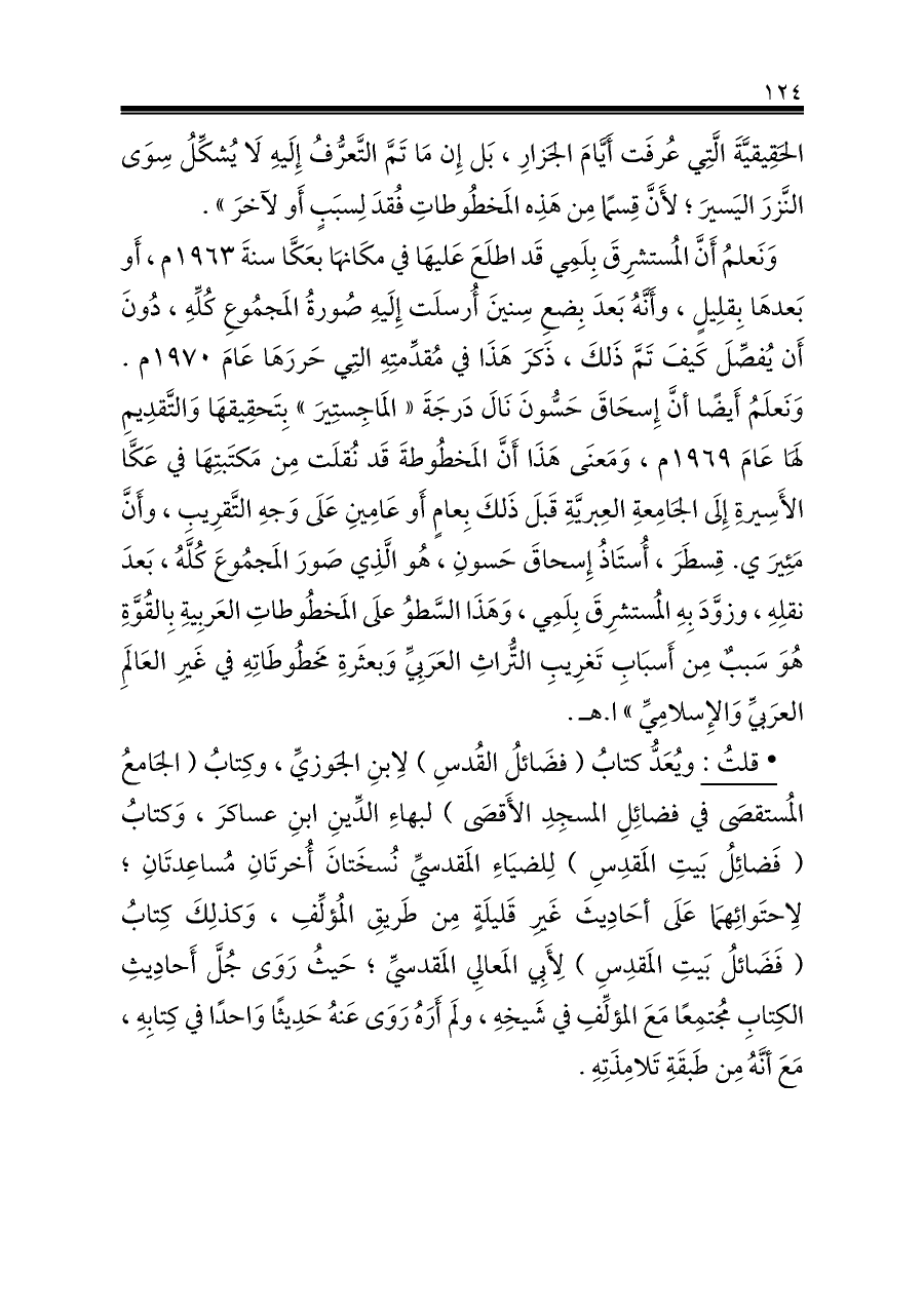 وَنَعلمُ أَنَّ المُستشرِقَ بِلَمِي قَد اطلَعَ عَليهَا في مكَانهَا بعَكَّا سنةَ ١٩٦٣ م، أَو بَعدهَا بِقلِيلٍ، وأَنَّهُ بَعدَ بِضعِ سِنينَ أُرسلَت إِلَيهِ صُورةُ المَجمُوعِ كُلِّهِ، دُونَ أَن يُفصِّلَ كَيفَ تَمَّ ذَلكَ، ذَكرَ هَذَا في مُقدِّمتِهِ التِي حَررَهَا عَامَ ١٩٧٠ م. وَنَعلَمُ أَيضًا أنَّ إِسحَاقَ حَسُّونَ نَالَ دَرجَةَ «المَاجِستِيرَ» بِتَحقِيقهَا وَالتَّقدِيمِ لَهَا عَامَ ١٩٦٩ م، وَمَعنَى هَذَا أَنَّ المَخطُوطةَ قَد نُقلَت مِن مَكتَبتِهَا في عَكَّا الأَسِيرةِ إِلَى الجَامِعةِ العِبريَّةِ قَبلَ ذَلكَ بِعامٍ أَو عَامِينِ عَلَى وَجهِ التَّقرِيبِ، وأَنَّ مَئِيرَ ي. قِسطَرَ، أُستَاذُ إِسحاقَ حَسونِ، هُو الَّذِي صَورَ المَجمُوعَ كُلَّهُ، بَعدَ نقلِهِ، وزوَّدَ بِهِ المُستشرِقَ بِلَمِي، وَهَذَا السَّطوُ علَى المَخطُوطاتِ العَربِيةِ بِالقُوَّةِ هُوَ سَببٌ مِن أَسبَابِ تَغرِيبِ التُّراثِ العَرَبِيِّ وَبعثَرةِ مَخطُوطَاتِهِ في غَيرِ العَالَمِ العرَبيِّ وَالإِسلامِيِّ» ا. هـ.