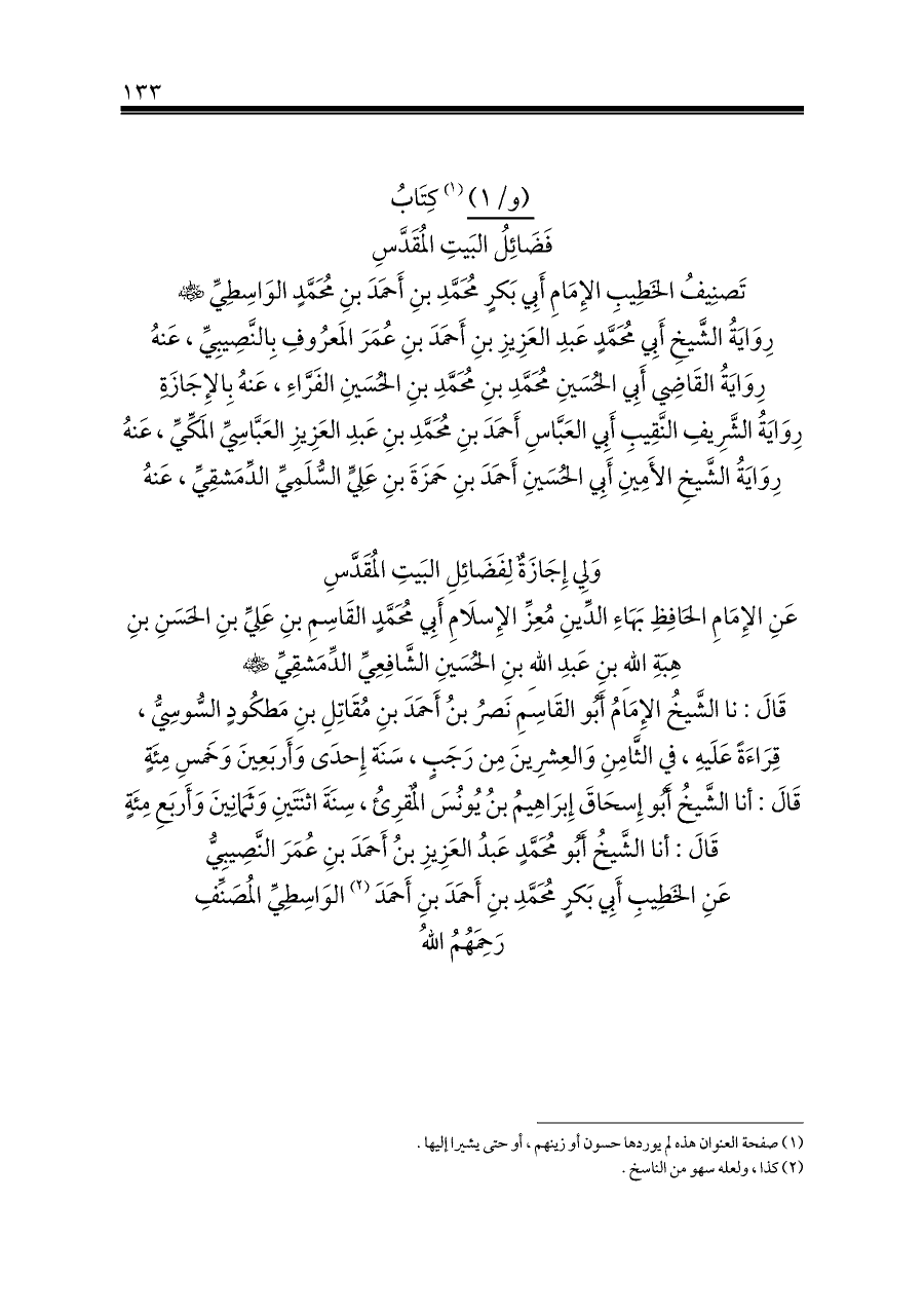 تَصنِيفُ الخَطِيبِ الإِمَامِ أَبِي بَكرٍ مُحَمَّدِ بنِ أَحمَدَ بنِ مُحَمَّدٍ الوَاسِطِيِّ - رضي الله عنه - رِوَايَةُ الشَّيخِ أَبِي مُحَمَّدٍ عَبدِ العَزِيزِ بنِ أَحمَدَ بنِ عُمَرَ المَعرُوفِ بِالنَّصِيبِيِّ، عَنهُ رِوَايَةُ القَاضِي أَبِي الحُسَينِ مُحَمَّدِ بنِ مُحَمَّدِ بنِ الحُسَينِ الفَرَّاءِ، عَنهُ بِالإِجَازَةِ رِوَايَةُ الشَّرِيفِ النَّقِيبِ أَبِي العَبَّاسِ أَحمَدَ بنِ مُحَمَّدِ بنِ عَبدِ العَزِيزِ العَبَّاسِيِّ المَكِّيِّ، عَنهُ رِوَايَةُ الشَّيخِ الأَمِينِ أَبِي الحُسَينِ أَحمَدَ بنِ حَمزَةَ بنِ عَلِيٍّ السُّلَمِيِّ الدِّمَشقِيِّ، عَنهُ