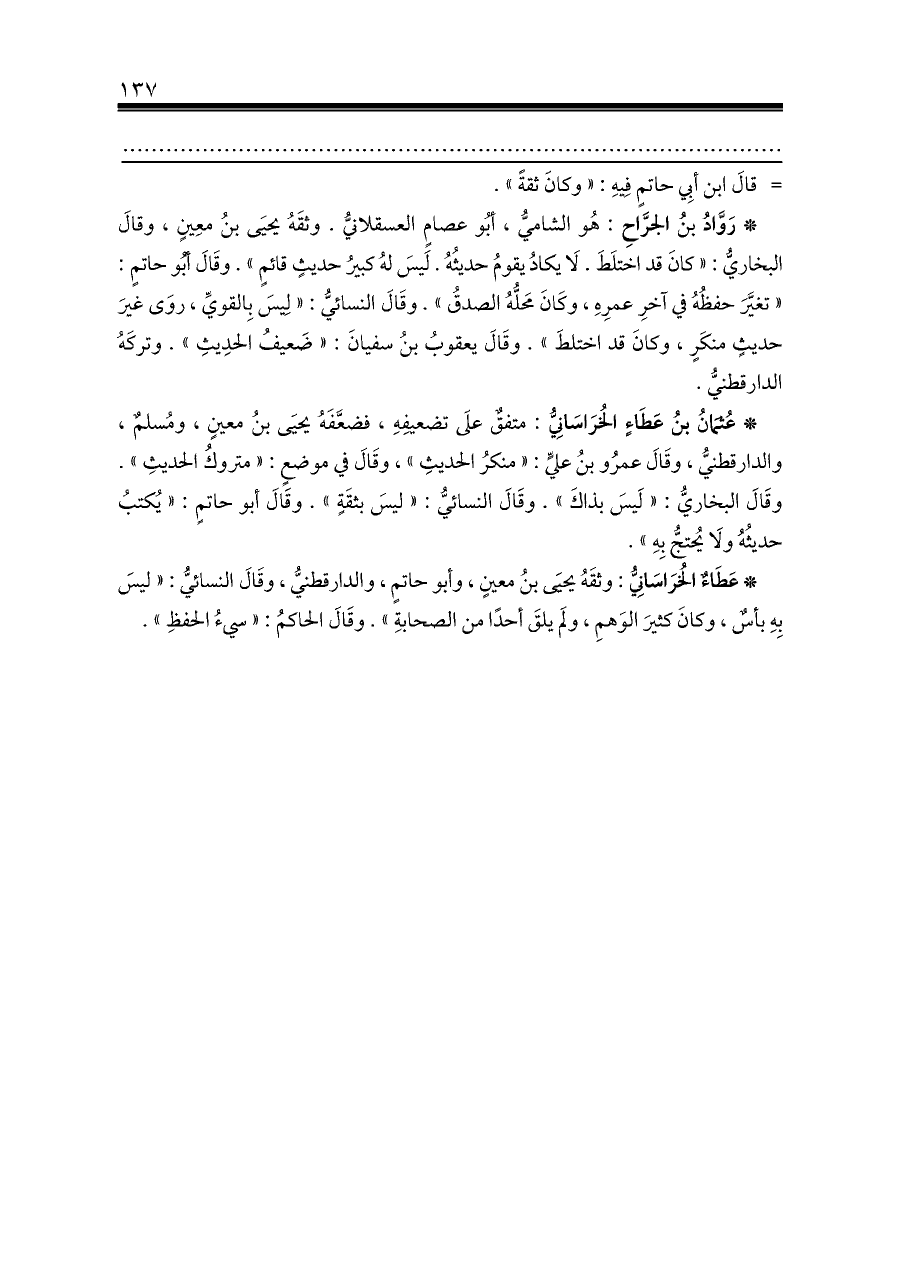 * عَطَاءٌ الخُرَاسَانِيُّ: وثقَهُ يحيَى بنُ معينٍ، وأبو حاتمٍ، والدارقطنيُّ، وقَالَ النسائيُّ: «ليسَ بِهِ بأسٌ، وكانَ كثيرَ الوَهمِ، ولَم يلقَ أحدًا من الصحابةِ». وقَالَ الحاكمُ: «سيءُ الحفظِ».