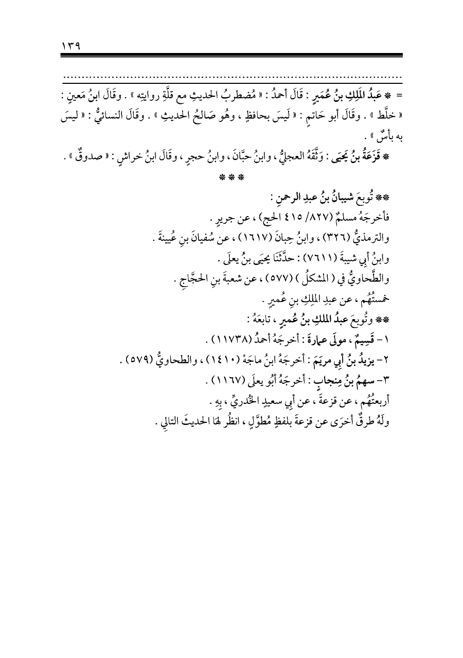 = * عَبدُ المَلِكِ بنُ عُمَيرٍ: قَالَ أحمدُ: «مُضطربُ الحديثِ مع قلَّةِ روايتِه». وقَالَ ابنُ مَعينٍ: «خلَّط». وقَالَ أبو حَاتمٍ: «لَيسَ بحافظٍ، وهُو صَالحُ الحديثِ». وقَالَ النسائيُّ: «ليسَ به بأسٌ».