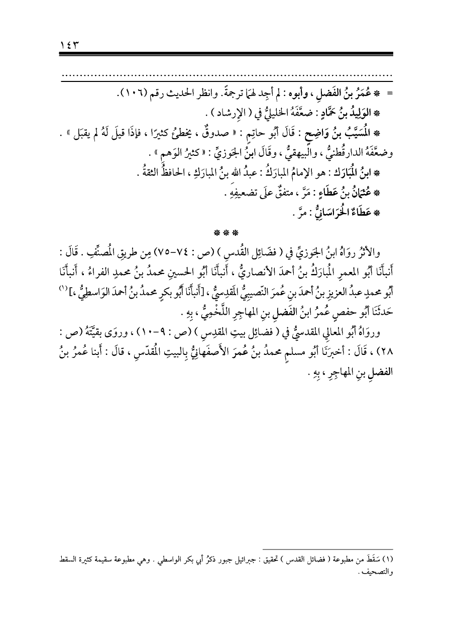 والأثرُ روَاهُ ابنُ الجَوزيِّ في (فضَائِل القُدسِ) (ص: ٧٤ - ٧٥) مِن طريقِ المُصنِّفِ. قَالَ: أَنبأَنَا أبُو المعمرِ المُبارَكُ بنُ أحمدَ الأنصاريُّ، أَنبأَنَا أبُو الحسينِ محمدُ بنُ محمدٍ الفراءُ، أَنبأَنَا أبُو محمدٍ عبدُ العزيزِ بنُ أحمدَ بنِ عُمرَ النّصيبِيُّ المَقدِسيُّ، [أَنبأَنَا أَبُو بكرٍ محمدُ بنُ أحمدَ الوَاسطِيُّ،] (¬١) حَدثَنَا أبُو حفصٍ عُمرُ ابنُ الفَضلِ بنِ المهاجِرِ اللَّخْمِيُّ، بِهِ.