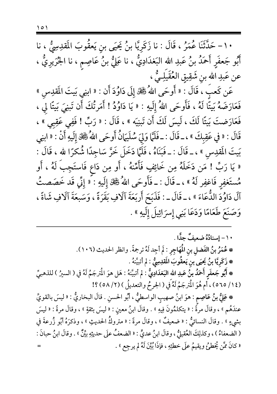 ١٠ - حَدَّثَنَا عُمَرُ، قَالَ: نا زَكَرِيَّا بنُ يَحيَى بنِ يَعقُوبَ المَقدِسِيُّ، نا أَبُو جَعفَرٍ أَحمَدُ بنُ عَبدِ اللهِ البَغدَادِيُّ، نا عَلِيُّ بنُ عَاصِمٍ، نا الجُرَيرِيُّ، عن عَبدِ اللهِ بنِ شَقِيقٍ العُقَيلِيُّ،