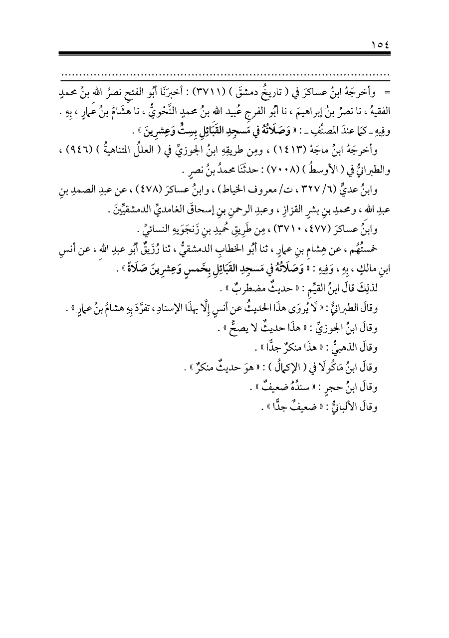 = وأخرجَهُ ابنُ عساكرَ في (تاريخُ دمشقَ) (٣٧١١): أخبرَنَا أبُو الفتحِ نصرُ اللهِ بنُ محمدٍ الفقيهُ، نا نصرُ بنُ إبراهيمَ، نا أبُو الفرجِ عُبيد اللهِ بنُ محمدٍ النَّحْويُّ، نا هشَامُ بنُ عمارٍ، بِهِ. وفِيهِ ـ كمَا عندَ المصنِّفِ ـ: «وَصَلَاتُهُ في مَسجِدِ القَبَائِلِ بِسِتٍّ وَعِشرِينَ».