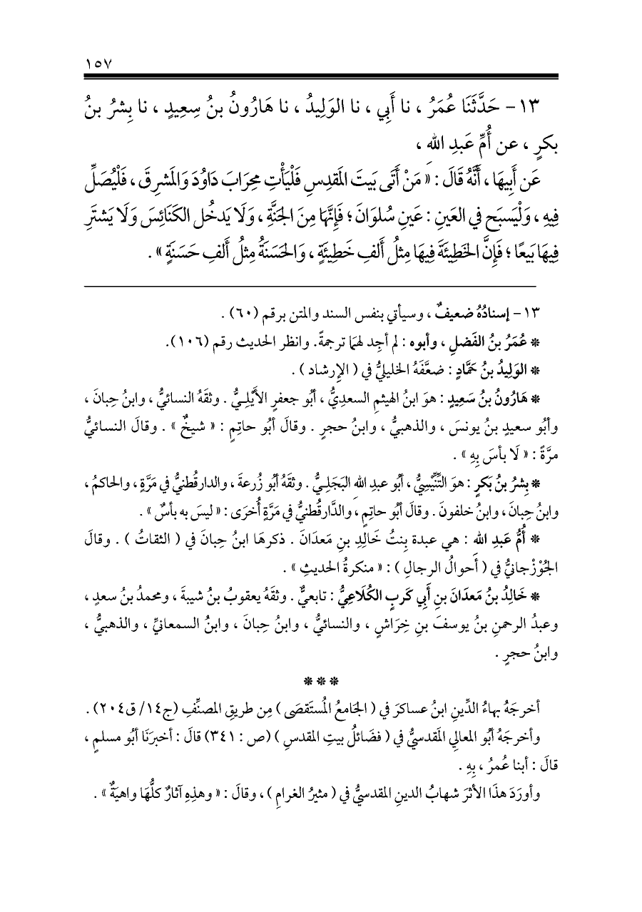 عَن أَبِيهَا، أَنَّهُ قَالَ: «مَنْ أَتَى بَيتَ المَقدِسِ فَلْيَأْتِ مِحرَابَ دَاوُدَ وَالمَشرِقَ، فَلْيُصَلِّ فِيهِ، وَلْيَسبَح في العَينِ: عَينِ سُلوَانَ؛ فَإِنَّهَا مِنَ الجَنَّةِ، وَلَا يَدخُل الكَنَائِسَ وَلَا يَشتَرِ فِيهَا بَيعًا؛ فَإِنَّ الخَطِيئَةَ فِيهَا مِثلُ أَلفِ خَطِيئَةٍ، وَالحَسَنَةُ مِثلُ أَلفِ حَسَنَةٍ».