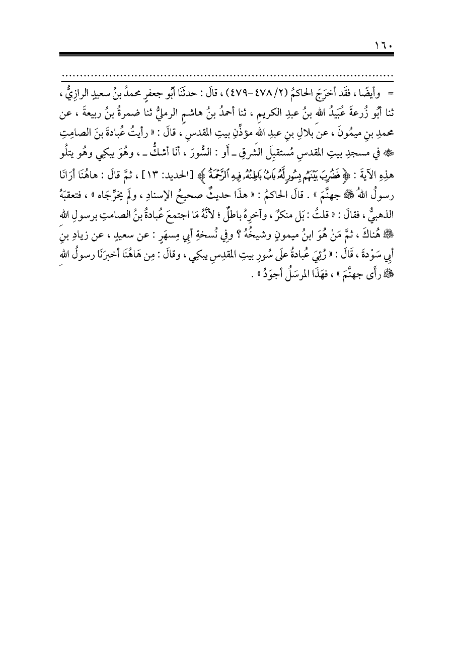= وأيضًا، فقَد أخرَجَ الحاكمُ (٢/ ٤٧٨ - ٤٧٩)، قالَ: حدثَنَا أبُو جعفرٍ محمدُ بنُ سعيدٍ الرازِيُّ، ثنا أبُو زُرعةَ عُبَيدُ اللهِ بنُ عبدِ الكريمِ، ثنا أحمدُ بنُ هاشمٍ الرمليُّ ثنا ضمرةُ بنُ ربيعةَ، عن محمدِ بنِ ميمُونَ، عن بلالِ بنِ عبدِ اللهِ مؤذِّنِ بيتِ المقدسِ، قالَ: «رأيتُ عُبادةَ بنَ الصامِتِ - رضي الله عنه - في مسجدِ بيتِ المقدسِ مُستقبِلَ الشرقِ ـ أَو: السُّورَ، أنَا أشكُّ ـ، وهُوَ يبكِي وهُو يتلُو هذِهِ الآيةَ: {فَضُرِبَ بَيْنَهُمْ بِسُورٍ لَهُ بَابٌ بَاطِنُهُ فِيهِ الرَّحْمَةُ} [الحديد: ١٣]، ثمَّ قالَ: هاهُنَا أرَانَا رسولُ اللهُ - صلى الله عليه وسلم - جهنَّمَ». قالَ الحاكمُ: «هذَا حديثٌ صحيحُ الإسنادِ، ولَم يخرِّجَاه»، فتعقبَهُ الذهبيُّ، فقالَ: «قلتُ: بَل منكرٌ، وآخرِهُ باطلٌ؛ لأنَّهُ مَا اجتمعَ عُبادةُ بنُ الصامتِ برسولِ اللهِ - صلى الله عليه وسلم - هُناكَ، ثمَّ مَنْ هُوَ ابنُ ميمونٍ وشيخُهُ؟ وفِي نُسخةِ أبِي مِسهَرٍ: عن سعيدٍ، عن زيادِ بنِ أبِي سَوْدةَ، قَالَ: «رُئِيَ عُبادةُ علَى سُورِ بيتِ المقدِسِ يبكِي، وقالَ: مِن هَاهُنَا أخبرَنَا رسولُ اللهِ - صلى الله عليه وسلم - رأَى جهنَّمَ»، فهَذَا المرسَلُ أجوَدُ».