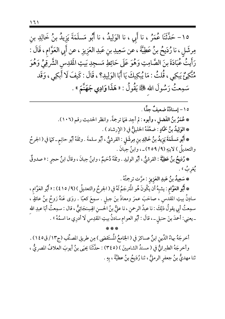 ١٥ - حَدَّثَنَا عُمَرُ، نا أَبِي، نا الوَلِيدُ، نا أَبُو مَسلَمَةَ يَزِيدُ بنُ خَالِدِ بنِ مِرشَلٍ، نا رُدَيحُ بنُ عَطِيَّةَ، عن سَعِيدِ بنِ عَبدِ العَزِيزِ، عن أَبِي العَوَّامِ، قَالَ: رَأَيتُ عُبَادَةَ بنَ الصَّامِتِ وَهُوَ عَلَى حَائِطِ مَسجِدِ بَيتِ المَقدِسِ الشَّرقِيِّ وَهُوَ مُتَّكِئٌ يَبكِي، قُلتُ: مَا يُبكِيكَ يَا أَبَا الوَلِيدِ؟، قَالَ: كَيفَ لَا أَبكِي، وَقَد