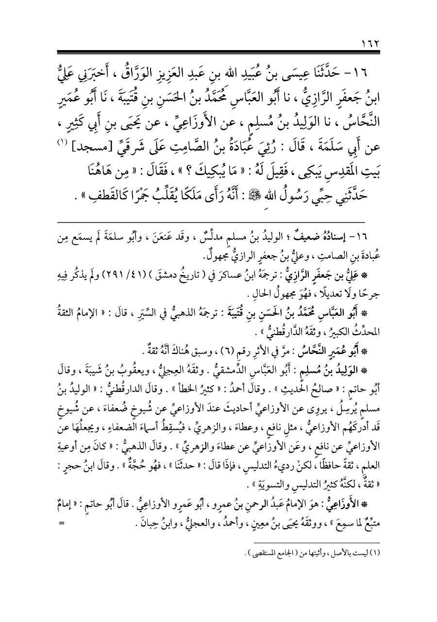 ١٦ - إسنادُهُ ضعيفٌ؛ الوليدُ بنُ مسلمٍ مدلِّسٌ، وقَد عَنعَنَ، وأبُو سلمَةَ لَم يسمَع مِن عُبادةَ بنِ الصامتِ، وعليُّ بنُ جعفرٍ الرازيُّ مجهولٌ.
