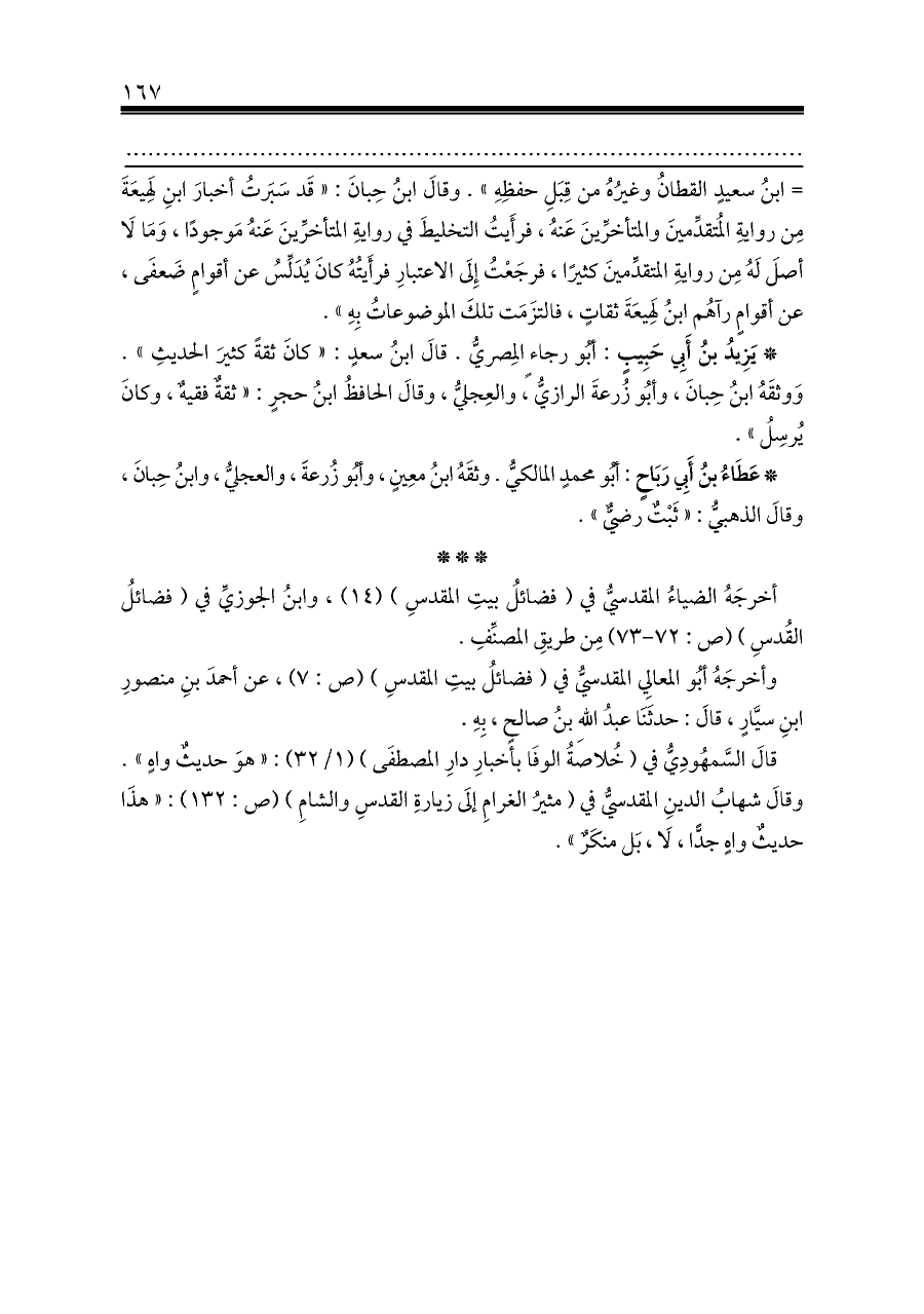 أخرجَهُ الضياءُ المقدسيُّ في (فضائلُ بيتِ المقدسِ) (١٤)، وابنُ الجوزيِّ في (فضائلُ القُدسِ) (ص: ٧٢ - ٧٣) مِن طريقِ المصنِّفِ.