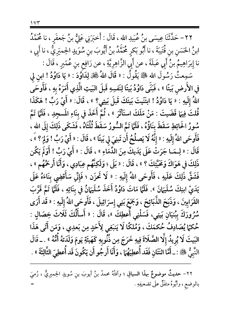 سَمِعتُ رَسُولَ اللهِ - صلى الله عليه وسلم - يَقُولُ: «قَالَ اللهُ - عز وجل - لِدَاوُدَ: «يَا دَاوُدُ! ابنِ لِي في الأَرضِ بَيتًا»، فَبَنَى دَاوُدُ بَيتًا لِنَفسِهِ قَبلَ البَيتِ الَّذِي أَمَرَهُ بِهِ، فَأَوحَى اللهُ إِلَيهِ: «يَا دَاوُدُ! ابتَنَيتَ بَيتَكَ قَبلَ بَيتِي؟»، قَالَ: «أَيْ رَبِّ! هَكَذَا قُلتَ فِيمَا قَضَيتَ: مَنْ مَلَكَ استَأثَرَ»، ثُمَّ أَخَذَ في بِنَاءِ المَسجِدِ، فَلَمَّا تَمَّ سُورُ الحَائِطِ سَقَطَ بِنَاؤُهُ، فَلَمَّا تَمَّ السُّورُ سَقَطَ ثُلُثَاهُ، فَشَكَى ذَلِكَ إِلَى اللهِ، فَأَوحَى اللهُ إِلَيهِ: «إِنَّهُ لَا يَصلُحُ أَن تَبنِيَ لِي بَيتًا»، قَالَ: «أَيْ رَبِّ! وَلِمَ؟»، قَالَ: «لِمَا جَرَتْ عَلَى يَدَيكَ مِنَ الدِّمَاءِ»، قَالَ: «أَيْ رَبِّ! أَوَلَم يَكُن ذَلِكَ في هَوَاكَ وَمَحَبَّتِكَ؟»، قَالَ: «بَلَى؛ وَلَكِنَّهُم عِبَادِي، وَأَنَا أَرحَمُهُم»، فَشَقَّ ذَلِكَ عَلَيهِ، فَأَوحَى اللهُ إِلَيهِ: «لَا تَحزَن؛ فَإِنِّي سَأَقضِي بِنَاءَهُ عَلَى يَدَيْ ابنِكَ سُلَيمَانَ». فَلَمَّا مَاتَ دَاوُدُ أَخَذَ سُلَيمَانُ في بِنَائِهِ، فَلَمَّا تَمَّ قَرَّبَ القَرَابِينَ، وَذَبَحَ الذَّبَائِحَ، وَجَمَعَ بَنِي إِسرَائِيلَ، فَأَوحَى اللهُ إِلَيهِ: «قَد أَرَى سُرُورَكَ بِبُنيَانِ بَيتِي، فَسَلْنِي أُعطِكَ»، قَالَ: «أَسأَلُكَ ثَلَاثَ خِصَالٍ: حُكمًا يُصَادِفُ حُكمَكَ، وَمُلكًا لَا يَنبَغِي لِأَحَدٍ مِن بَعدِي، وَمَن أَتَى هَذَا البَيتَ لَا يُرِيدُ إِلَّا الصَّلَاةَ فِيهِ خَرَجَ مِن ذُنُوبِهِ كَهَيئَةِ يَومَ وَلَدَتهُ أُمُّهُ». ـ قَالَ النَّبِيُّ - صلى الله عليه وسلم -: ـ أَمَّا اثنَتَانِ فَقَد أُعطِيَهُمَا، وَأَنَا أَرجُو أَن يَكُونَ قَد أُعطِيَ الثَّالِثَةَ».