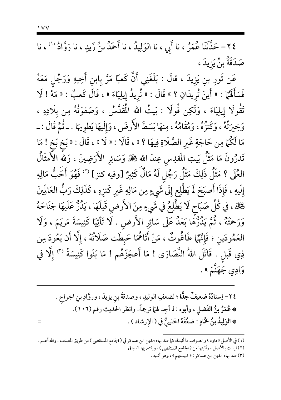 عَن ثَورِ بنِ يَزِيدَ، قالَ: بَلَغَنِي أَنَّ كَعبًا مَرَّ بِابنِ أَخِيهِ وَرَجُلٍ مَعَهُ فَسَأَلَهُمَا: «أَينَ تُرِيدَانِ؟» قَالَ: «نُرِيدُ إِيلِيَاءَ»، قَالَ كَعبٌ: «مَهْ! لَا تَقُولَا إِيلِيَاءَ، وَلَكِن قُولَا: بَيتُ اللهِ المُقَدَّسُ، وَصَفوَتُهُ مِن بِلَادِهِ، وَخِيرَتُهُ، وَكَنزُهُ، وَمُقَامُهُ، مِنهَا بَسَطَ الأَرضَ , وَإِلَيهَا يَطوِيهَا. ـ ثُمَّ قَالَ: ـ مَا لَكُمَا مِن حَاجَةٍ غَيرِ الصَّلَاةِ فِيهَا؟»، قَالَا: «لَا»، قَالَ: «بَخٍ بَخٍ! مَا تَدرُونَ مَا مَثَلُ بَيتِ المَقدِسِ عِندَ اللهِ - عز وجل - وَسَائِرِ الأَرَضِينَ، وَللهِ الأَمثَالُ العُلَى؟ مَثَلُ ذَلِكَ مَثَلُ رَجُلٍ لَهُ مَالٌ كَثِيرٌ [وفيه كنز] (¬٢) فَهُوَ أَحَبُّ مَالِهِ إِلَيهِ، فَإِذَا أَصبَحَ لَم يَطَّلِع إِلَى شَيءٍ مِن مَالِهِ غَيرِ كَنزِهِ، كَذَلِكَ رَبُّ العَالَمِينَ - عز وجل -، في كُلِّ صَبَاحٍ لَا يَطَّلِعُ في شَيءٍ مِنَ الأَرضِ قَبلَهَا، يَدُرُّ عَلَيهَا جَنَاحَهُ وَرَحمَتَهُ، ثُمَّ يَدُرُّهَا بَعْدُ عَلَى سَائِرِ الأَرضِ. لَا تَأتِيَا كَنِيسَةَ مَريَمَ، وَلَا العَمُودَينِ؛ فَإِنَّهُمَا طَاغُوتٌ، مَنْ أَتَاهُمَا حَبِطَت صَلَاتُهُ، إِلَّا أَن يَعُودَ مِن ذِي قَبلٍ. قَاتَلَ اللهُ النَّصَارَى! مَا أَعجَزَهُم! مَا بَنَوا كَنِيسَةً (¬٣) إِلَّا في وَادِي جَهَنَّمَ».