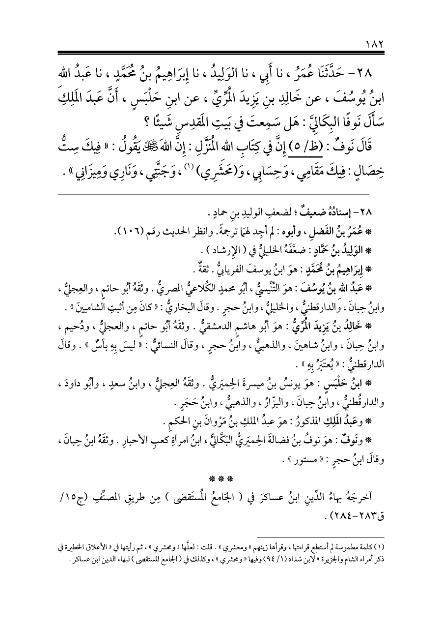 ٢٨ - حَدَّثَنَا عُمَرُ، نا أَبِي، نا الوَلِيدُ، نا إِبرَاهِيمُ بنُ مُحَمَّدٍ، نا عَبدُ اللهِ ابنُ يُوسُفَ، عن خَالِدِ بنِ يَزِيدَ المُرِّيِّ، عن ابنِ حَلْبَسٍ، أَنَّ عَبدَ المَلِكِ سَأَلَ نَوفًا البِكَالِيَّ: هَل سَمِعتَ في بَيتِ المَقدِسِ شَيئًا؟