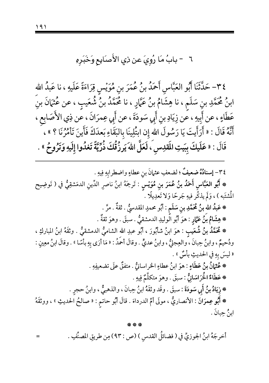 ٣٤ - حَدَّثَنَا أَبُو العَبَّاسِ أَحمَدُ بنُ عُمَرَ بنِ مُوَيْسٍ قِرَاءَةً عَلَيهِ، نا عَبدُ اللهِ ابنُ مُحَمَّدِ بنِ سَلَمٍ، نا هِشَامُ بنُ عَمَّارٍ، نا مُحَمَّدُ بنُ شُعَيبٍ، عن عُثمَانَ بنِ عَطَاءٍ، عن أَبِيهِ، عن زِيَادِ بنِ أَبِي سَودَةَ، عن أَبِي عِمرَانَ، عن ذِي الأَصَابِعِ، أَنَّهُ قَالَ: «أَرَأَيتَ يَا رَسُولَ اللهِ إِن ابتُلِينَا بِالبَقَاءِ بَعدَكَ فَأَينَ تَأمُرُنَا؟»،