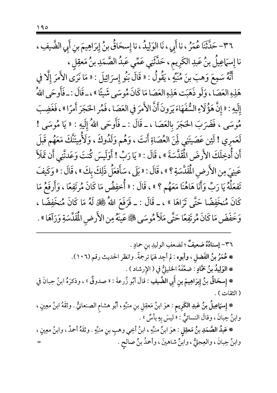 أَنَّهُ سَمِعَ وَهبَ بنَ مُنَبِّهٍ، يَقُولُ: «قَالَ بَنُو إِسرَائِيلَ: «مَا نَرَى الأَمرَ إِلَّا في هَذِهِ العَصَا، وَلَو ذَهَبَت هَذِهِ العَصَا مَا كَانَ مُوسَى شَيئًا»، ـ قَالَ: ـ فَأَوحَى اللهُ إِلَيهِ: «إِنَّ هَؤُلَاءِ السُّفَهَاءَ يَرَونَ أَنَّ الأَمرَ في العَصَا، فَمُر الحَجَرَ أَمرًا»، فَغَضِبَ مُوسَى، فَضَرَبَ الحَجَرَ بِالعَصَا، ـ قَالَ: ـ فَأَوحَى اللهُ إِلَيهِ: «يَا مُوسَى! لَعَمرِي! لَئِن عَصَيتَنِي لَمِنَ العُصَاةِ أَنتَ، وَهُم وَلَدُوكَ، وَلَأُمِيتَنَّكَ مَعَهُم قَبلَ أَن أُدخِلَكَ الأَرضَ المُقَدَّسَةَ»، قَالَ: «يَا رَبِّ! أَوَلَيسَ كُنتَ وَعَدتَّنِي أَن تَملَأَ عَينِيَ مِن الأَرضِ المُقَدَّسَةِ؟»، قَالَ: «بَلَى، سَأَفعَلُ ذَلِكَ بِكَ»، قَالَ: «وَكَيفَ تَفعَلُهُ يَا رَبِّ وَأَنَا هَاهُنَا مَعَهُم؟»، قَالَ: «أُخفِضُ مَا كَانَ مُرتَفِعًا، وَأَرفَعُ مَا كَانَ مُنخَفِضًا حَتَّى تَرَاهَا»، ـ قَالَ: ـ فَرَفَعَ اللهُ - عز وجل - لَهُ مَا كَانَ مُنخَفِضًا، وَخَفَضَ مَا كَانَ مُرتَفِعًا حَتَّى مَلَأَ مُوسَى - صلى الله عليه وسلم - عَينَهُ مِن الأَرضِ المُقَدَّسَةِ وَرَآهَا».