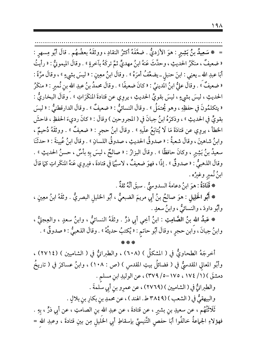 = * سَعِيدُ بنُ بَشِيرٍ: هوَ الأزديُّ. ضعَّفَهُ أكثرُ النقادِ، ووثقَهُ بعضُهُم. قالَ أبُو مِسهرٍ: «ضعيفٌ، منكَرُ الحديثِ، وحدَّثَ عَنهُ ابنُ مهديٍّ ثمَّ تركَهُ بآخرةٍ». وقالَ الميمونيُّ: «رأيتُ أبَا عبدِ اللهِ ـ يعنِي: ابنَ حنبلٍ ـ يضعِّفُ أمرَهُ». وقالَ ابنُ معِينٍ: «ليسَ بشيءٍ»، وقالَ مرَّةً: «ضعيفٌ». وقالَ عليُّ ابنُ المدينيِّ: «كانَ ضعيفًا». وقالَ محمدُ بنُ عبدِ اللهِ بنِ نُميرٍ: «منكَرُ الحديثِ، ليسَ بشيءٍ، ليسَ بقويِّ الحديثِ، يروِي عن قتادةَ المنكَرَاتِ». وقالَ البخاريُّ: «يتكلمُونَ في حفظِهِ، وهو يُحتمَلُ». وقالَ النسائيُّ: «ضعيفٌ». وقالَ الدارقطنيُّ: «ليسَ بقويٍّ في الحديثِ»، وذكرَهُ ابنُ حِبانَ في (المجروحين) وقالَ: «كانَ رديءَ الحفظِ، فاحشَ الخطأ، يروِي عن قتادَةَ مَا لَا يُتابَعُ علَيهِ». وقالَ ابنُ حجرٍ: «ضعيفٌ». ووثقَهُ دُحيمٌ، وابنُ شاهينَ، وقالَ شعبةُ: «صدوقُ الحديثِ، صدوقُ اللسانِ». وقالَ ابنُ عُيينةَ: «حدثَنَا سعيدُ بنُ بَشِيرٍ، وكانَ حافظًا». وقالَ البزارُ: «صالحٌ، ليسَ بِهِ بأسٌ، حسنُ الحديثِ». وقالَ الذهبيُّ: «صدوقٌ». إذًا، فهوَ ضعيفٌ، لاسيَّمَا في قتادةَ، فيروِي عَنهُ المنكَراتِ كمَا قالَ ابنُ نُميرٍ وغيرُه.