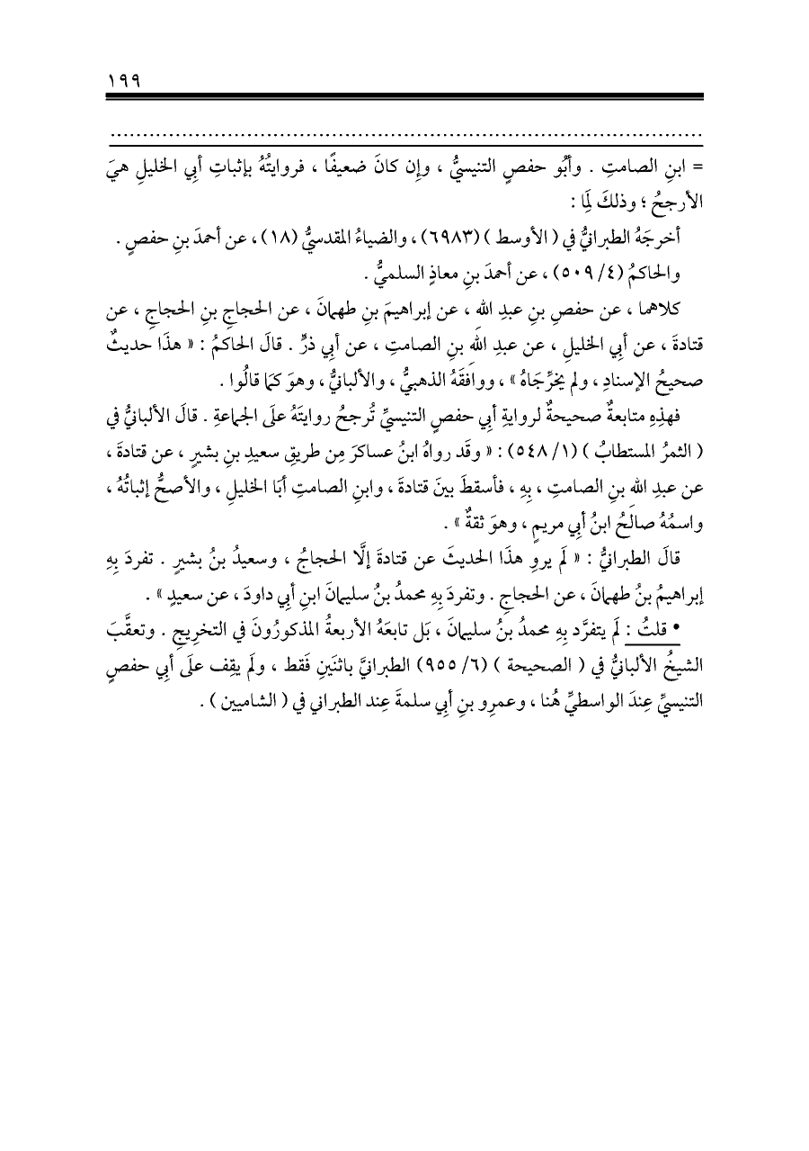 = ابنِ الصامتِ. وأبُو حفصٍ التنيسيُّ، وإِن كانَ ضعيفًا، فروايتُهُ بإثباتِ أبِي الخليلِ هيَ الأرجحُ؛ وذلكَ لِمَا: