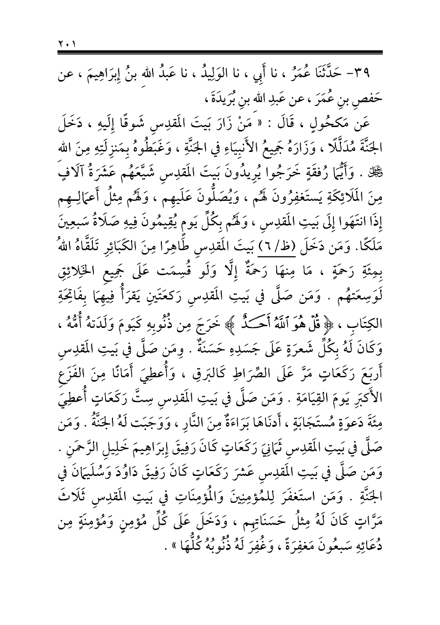 عَن مَكحُولٍ، قَالَ: «مَنْ زَارَ بَيتَ المَقدِسِ شَوقًا إِلَيهِ، دَخَلَ الجَنَّةَ مُدَلَّلًا، وَزَارَهُ جَمِيعُ الأَنبِيَاءِ في الجَنَّةِ، وَغَبَطُوهُ بِمَنزِلَتِهِ مِنَ اللهِ - عز وجل -. وَأَيُّمَا رُفقَةٍ خَرَجُوا يُرِيدُونَ بَيتَ المَقدِسِ شَيَّعَهُم عَشَرَةُ آلَافٍ مِنَ المَلَائِكَةِ يَستَغفِرُونَ لَهُم، وَيُصَلُّونَ عَلَيهِم، وَلَهُم مِثلُ أَعمَالِهِم إِذَا انتَهَوا إِلَى بَيتِ المَقدِسِ، وَلَهُم بِكُلِّ يَومٍ يُقِيمُونَ فِيهِ صَلَاةُ سَبعِينَ مَلَكًا. وَمَن دَخَلَ (ظ/٦) بَيتَ المَقدِسِ طَاهِرًا مِنَ الكَبَائِرِ تَلَقَّاهُ اللهُ بِمِئَةِ رَحمَةٍ، مَا مِنهَا رَحمَةٌ إِلَّا وَلَو قُسِمَت عَلَى جَمِيعِ الخَلِائِقِ لَوَسِعَتهُم. وَمَن صَلَّى في بَيتِ المَقدِسِ رَكعَتَينِ يَقرَأُ فِيهِمَا بِفَاتِحَةِ الكِتَابِ، {قُلْ هُوَ اللَّهُ أَحَدٌ} خَرَجَ مِن ذُنُوبِهِ كَيَومَ وَلَدَتهُ أُمُّهُ، وَكَانَ لَهُ بِكُلِّ شَعرَةٍ عَلَى جَسَدِهِ حَسَنَةٌ. وِمَن صَلَّى في بَيتِ المَقدِسِ أَربَعَ رَكَعَاتٍ مَرَّ عَلَى الصِّرَاطِ كَالبَرقِ، وَأُعطِيَ أَمَانًا مِنَ الفَزَعِ الأَكبَرِ يَومَ القِيَامَةِ. وَمَن صَلَّى في بَيتِ المَقدِسِ سِتَّ رَكَعَاتٍ أُعطِيَ مِئَةَ دَعوَةٍ مُستَجَابَةٍ، أَدنَاهَا بَرَاءَةٌ مِنَ النَّارِ، وَوَجَبَت لَهُ الجَنَّةُ. وَمَن صَلَّى في بَيتِ المَقدِسِ ثَمَانِيَ رَكَعَاتٍ كَانَ رَفِيقَ إِبرَاهِيمَ خَلِيلِ الرَّحمَنِ. وَمَن صَلَّى في بَيتِ المَقدِسِ عَشرَ رَكَعَاتٍ كَانَ رَفِيقَ دَاوُدَ وَسُلَيمَانَ في الجَنَّةِ. وَمَن استَغفَرَ لِلمُؤمِنِينَ وَالمُؤمِنَاتِ في بَيتِ المَقدِسِ ثَلَاثَ مَرَّاتٍ كَانَ لَهُ مِثلُ حَسَنَاتِهِم، وَدَخَلَ عَلَى كُلِّ مُؤمِنٍ وَمُؤمِنَةٍ مِن دُعَائِهِ سَبعُونَ مَغفِرَةً، وَغُفِرَ لَهُ ذُنُوبُهُ كُلُّهَا».