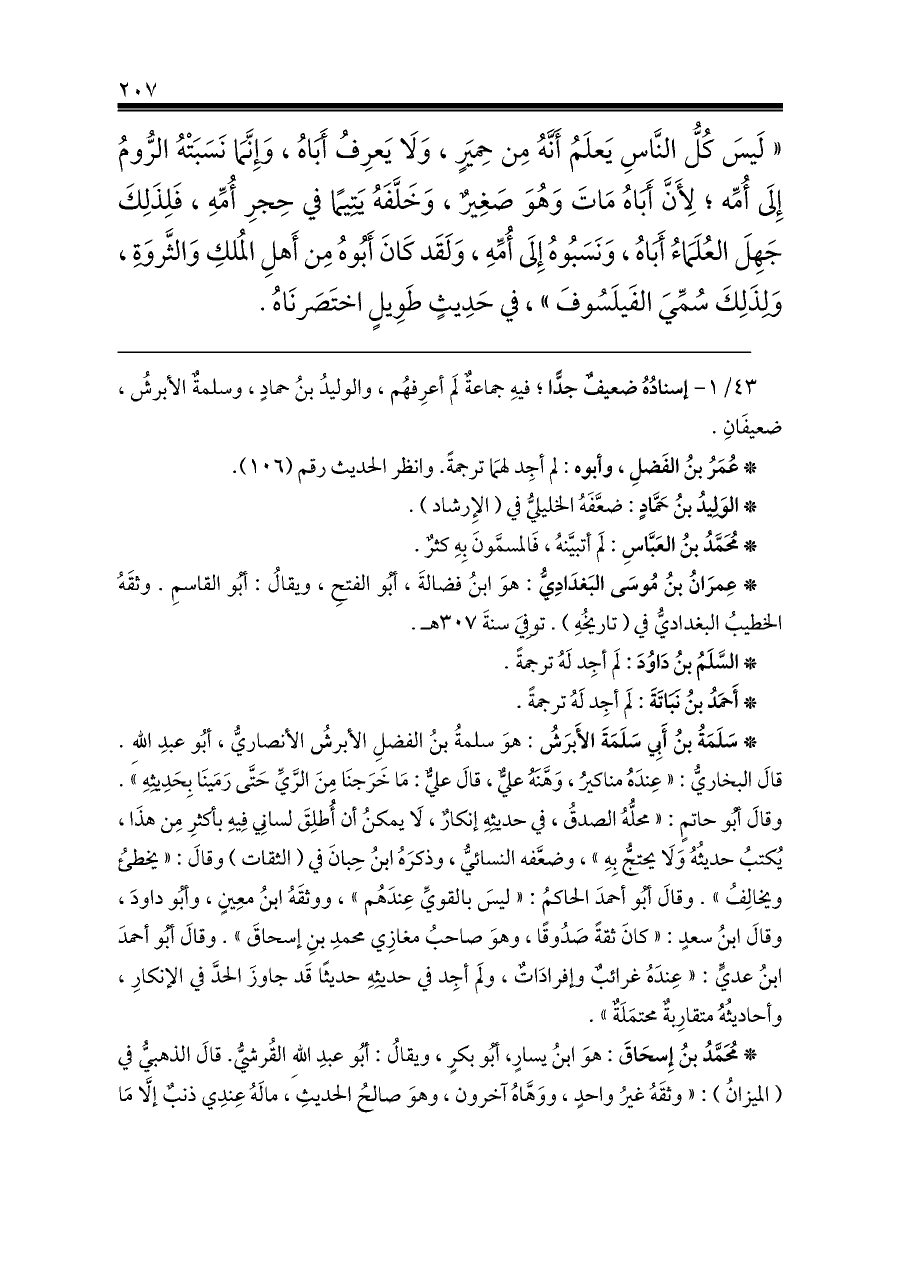 ٤٣/ ١ - إسنادُهُ ضعيفٌ جدًّا؛ فيهِ جماعةٌ لَم أعرِفهُم، والوليدُ بنُ حمادٍ، وسلمةٌ الأبرشُ، ضعيفَانِ.