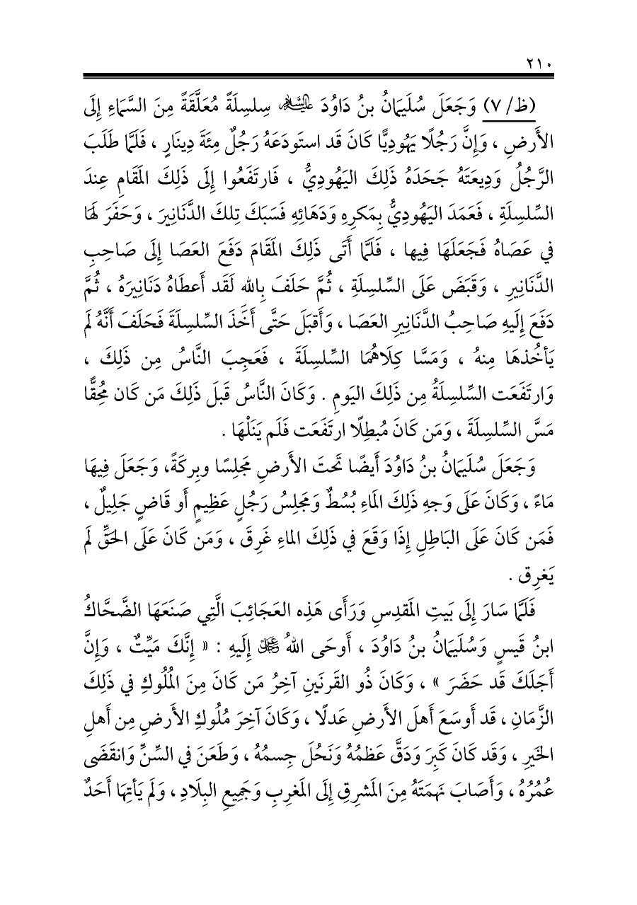 (ظ/٧) وَجَعَلَ سُلَيمَانُ بنُ دَاوُدَ - عليها السلام - سِلسِلَةً مُعَلَّقَةً مِنَ السَّمَاءِ إِلَى الأَرضِ، وَإِنَّ رَجُلًا يَهُودِيًّا كَانَ قَد استَودَعَهُ رَجُلٌ مِئَةَ دِينَارٍ، فَلَمَّا طَلَبَ الرَّجُلُ وَدِيعَتَهُ جَحَدَهُ ذَلِكَ اليَهُودِيُّ، فَارتَفَعُوا إِلَى ذَلِكَ المَقَامِ عِندَ السِّلسِلَةِ، فَعَمَدَ اليَهُودِيُّ بِمَكرِهِ وَدَهَائِهِ فَسَبَكَ تِلكَ الدَّنَانِيرَ، وَحَفَرَ لَهَا في عَصَاهُ فَجَعَلَهَا فِيها، فَلَمَّا أَتَى ذَلِكَ المَقَامَ دَفَعَ العَصَا إِلَى صَاحِبِ الدَّنَانِيرِ، وَقَبَضَ عَلَى السِّلسِلَةِ، ثُمَّ حَلَفَ بِاللهِ لَقَد أَعطَاهُ دَنَانِيرَهُ، ثُمَّ دَفَعَ إِلَيهِ صَاحِبُ الدَّنَانِيرِ العَصَا، وَأَقبَلَ حَتَّى أَخَذَ السِّلسِلَةَ فَحَلَفَ أَنَّهُ لَم يَأخُذهَا مِنهُ، وَمَسَّا كِلَاهُمَا السِّلسِلَةَ، فَعَجِبَ النَّاسُ مِن ذَلِكَ، وَارتَفَعَت السِّلسِلَةُ مِن ذَلِكَ اليَومِ. وَكَانَ النَّاسُ قَبلَ ذَلِكَ مَن كَان مُحِقًّا مَسَّ السِّلسِلَةَ، وَمَن كَانَ مُبطِلًا ارتَفَعَت فَلَم يَنَلْهَا.