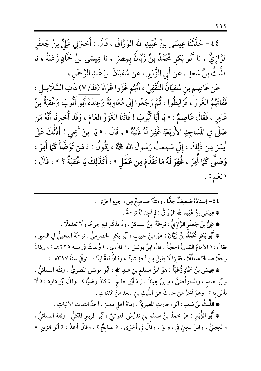 عَن عَاصِمِ بنِ سُفيَانَ الثَّقَفِيِّ، أَنَّهُم غَزَوا غَزَاةَ (ظ/٧) ذَاتِ السَّلَاسِلِ، فَفَاتَهُمُ الغَزوُ، فَرَابَطُوا، ثُمَّ رَجَعُوا إِلَى مُعَاوِيَةَ وَعِندَهُ أَبُو أَيُّوبَ وَعُقبَةُ بنُ عَامِرٍ، فَقَالَ عَاصِمٌ: «يَا أَبَا أَيُّوبَ! فَاتَنَا الغَزوُ العَامَ، وَقَد أُخبِرنَا أَنَّهُ مَن صَلَّى في المَسَاجِدِ الأَربَعَةِ غُفِرَ لَهُ ذَنبُهُ»، قَالَ: «يَا ابنَ أَخِي! أَدُلُّكَ عَلَى أَيسَرَ مِن ذَلِكَ، إِنِّي سَمِعتُ رَسُولَ اللهِ - صلى الله عليه وسلم -، يَقُولُ: «مَن تَوَضَّأَ كَمَا أُمِرَ، وَصَلَّى كَمَا أُمِرَ، غُفِرَ لَهُ مَا تَقَدَّمَ مِن عَمَلٍ»، أَكَذَلِكَ يَا عُقبَةُ؟»، قَالَ: «نَعَم».