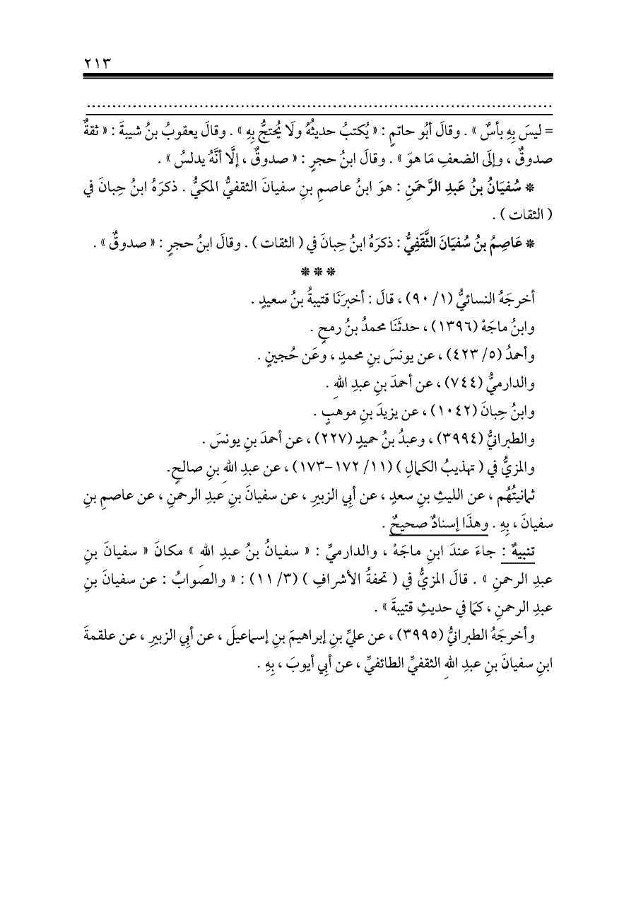 تنبيهٌ: جاءَ عندَ ابنِ ماجَهْ، والدارميِّ: «سفيانُ بنُ عبدِ اللهِ» مكانَ «سفيانَ بنِ عبدِ الرحمنِ». قالَ المزيُّ في (تحفةُ الأشرافِ) (٣/ ١١): «والصوابُ: عن سفيانَ بنِ عبدِ الرحمنِ، كمَا في حديثِ قتيبةَ».