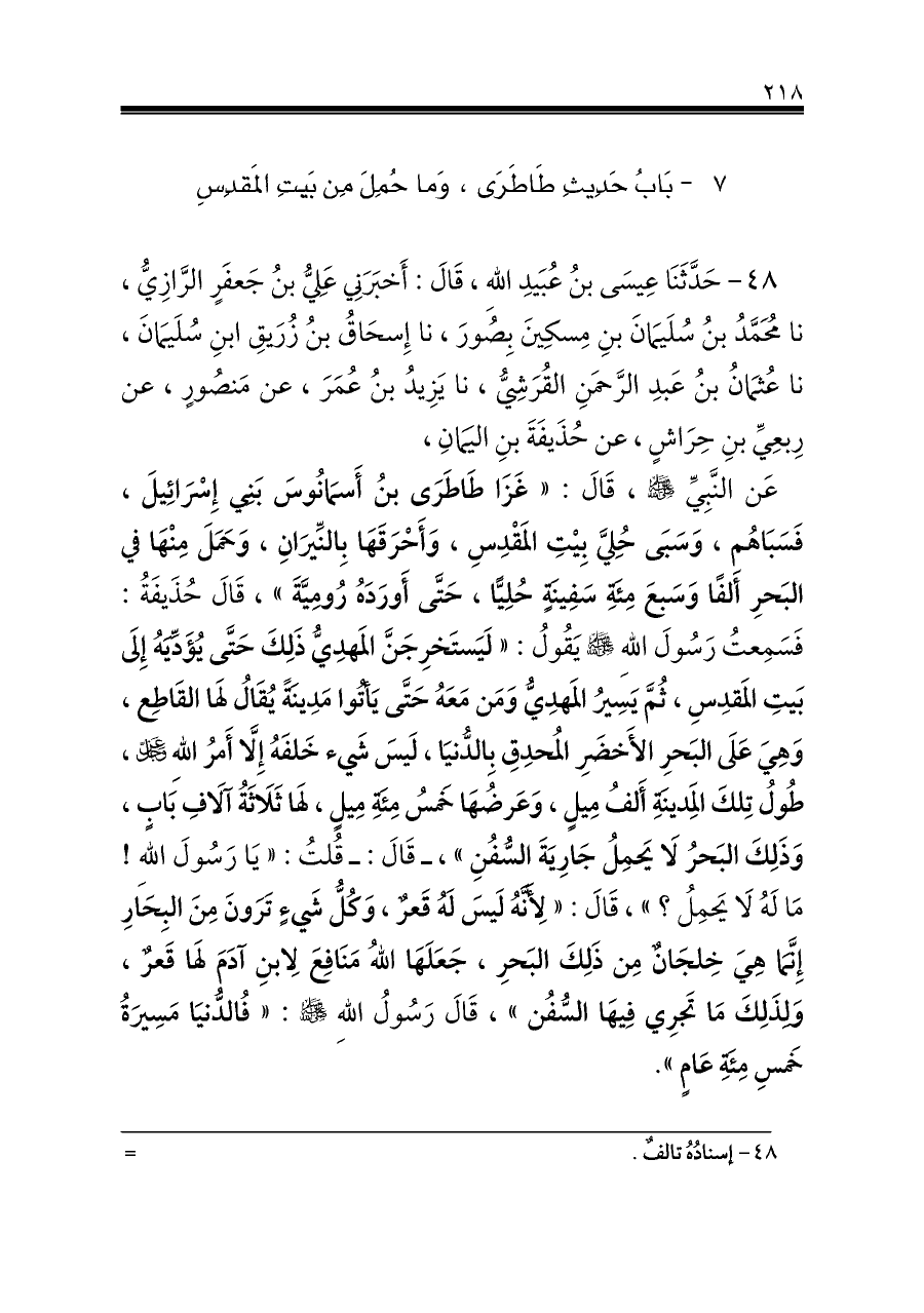 عَن النَّبِيِّ - صلى الله عليه وسلم -، قَالَ: «غَزَا طَاطَرَى بنُ أَسمَانُوسَ بَنِي إِسْرَائِيلَ، فَسَبَاهُم، وَسَبَى حُلِيَّ بِيْتِ المَقْدِسِ، وَأَحْرَقَهَا بِالنِّيرَانِ، وَحَمَلَ مِنْهَا في البَحرِ أَلفًا وَسَبعَ مِئَةِ سَفِينَةٍ حُلِيًّا، حَتَّى أَورَدَهُ رُومِيَّةَ»، قَالَ حُذَيفَةُ: فَسَمِعتُ رَسُولَ اللهِ - صلى الله عليه وسلم - يَقُولُ: «لَيَستَخرِجَنَّ المَهدِيُّ ذَلِكَ حَتَّى يُؤَدِّيَهُ إِلَى بَيتِ المَقدِسِ، ثُمَّ يَسِيرُ المَهدِيُّ وَمَن مَعَهُ حَتَّى يَأتُوا مَدِينَةً يُقَالُ لَهَا القَاطِع، وَهِيَ عَلَى البَحرِ الأَخضَرِ المُحدِقِ بِالدُّنيَا، لَيسَ شَيء خَلفَهُ إِلَّا أَمرُ اللهِ - عز وجل -، طُولُ تِلكَ الَمِدينَةِ أَلفُ مِيلٍ، وَعَرضُهَا خَمسُ مِئَةِ مِيلٍ، لَهَا ثَلَاثَةُ آلَافِ بَابٍ، وَذَلِكَ البَحرُ لَا يَحمِلُ جَارِيَةَ السُّفُنِ»، ـ قَالَ: ـ قُلتُ: «يَا رَسُولَ اللهِ! مَا لَهُ لَا يَحمِلُ؟»، قَالَ: «لِأَنَّهُ لَيسَ لَهُ قَعرٌ، وَكُلُّ شَيءٍ تَرَونَ مِنَ البِحَارِ إِنَّمَا هِيَ خِلجَانٌ مِن ذَلِكَ البَحرِ، جَعَلَهَا اللهُ مَنَافِعَ لِابنِ آدَمَ لَهَا قَعرٌ، وَلِذَلِكَ مَا تَجرِي فِيهَا السُّفُن»، قَالَ رَسُولُ اللهِ - صلى الله عليه وسلم -: «فُالدُّنيَا مَسِيرَةُ خَمسِ مِئَةِ عَامٍ».