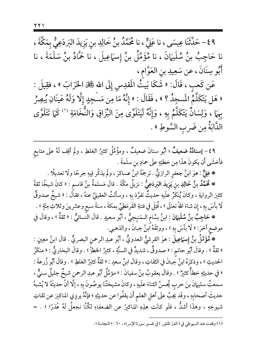 ٤٩ - حَدَّثَنَا عِيسَى، نا عَلِيٌّ، نا مُحَمَّدُ بنُ خَالِدِ بنِ يَزِيدَ البَردَعِيُّ بِمَكَّةَ، نا حَاجِبُ بنُ سُلَيمَانَ، نا مُؤَمَّلُ بنُ إِسمَاعِيلَ، نا حَمَّادُ بنُ سَلَمَةَ، نا أَبُو سِنَانَ، عن سَعِيدِ بنِ العَوَّامِ،