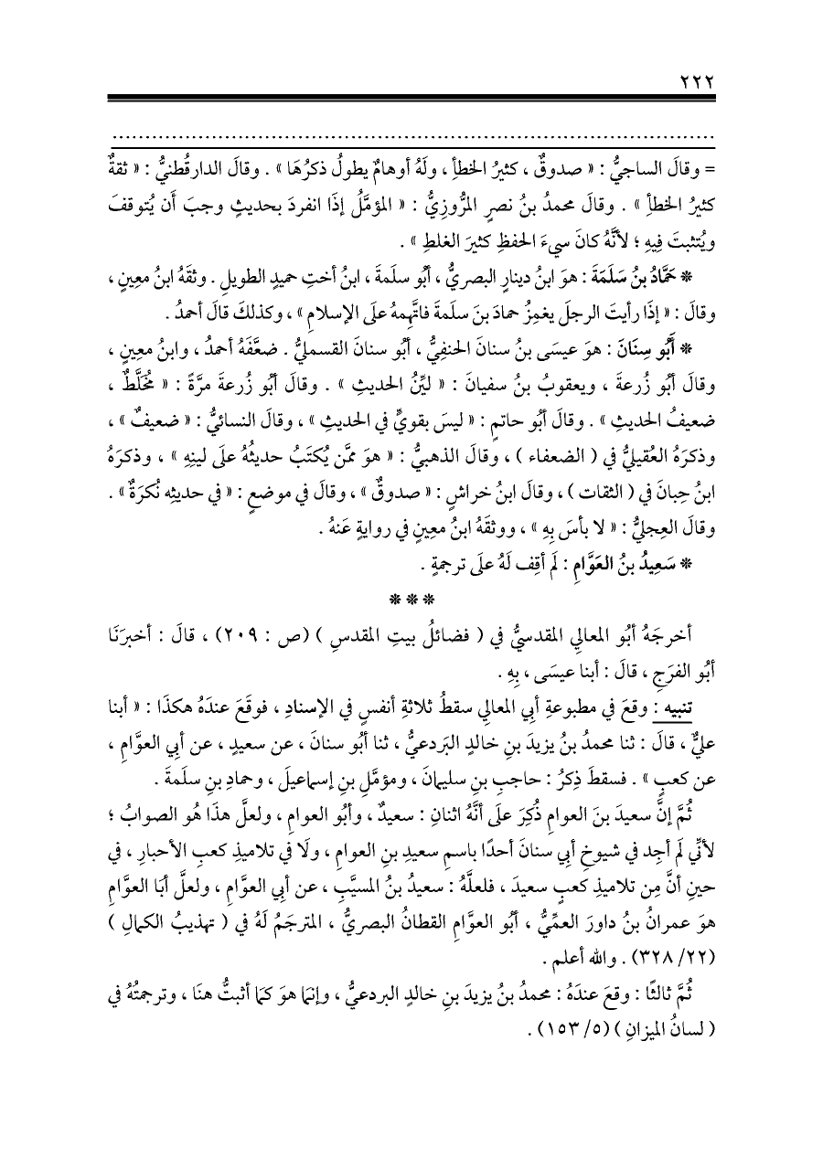 ثُمَّ إنَّ سعيدَ بنَ العوامِ ذُكِرَ علَى أنَّهُ اثنانِ: سعيدٌ، وأبُو العوامِ، ولعلَّ هذَا هُو الصوابُ؛ لأنِّي لَم أجِد في شيوخِ أبِي سنانَ أحدًا باسمِ سعيدِ بنِ العوامِ، ولَا في تلاميذِ كعبِ الأحبارِ، في حينِ أنَّ مِن تلاميذِ كعبٍ سعيدَ، فلعلَّهُ: سعيدُ بنُ المسيَّبِ، عن أبِي العوَّامِ، ولعلَّ أبَا العوَّامِ هوَ عمرانُ بنُ داورَ العمِّيُّ، أبُو العوَّامِ القطانُ البصريُّ، المترجَمُ لَهُ في (تهذيبُ الكمالِ) (٢٢/ ٣٢٨). والله أعلم.