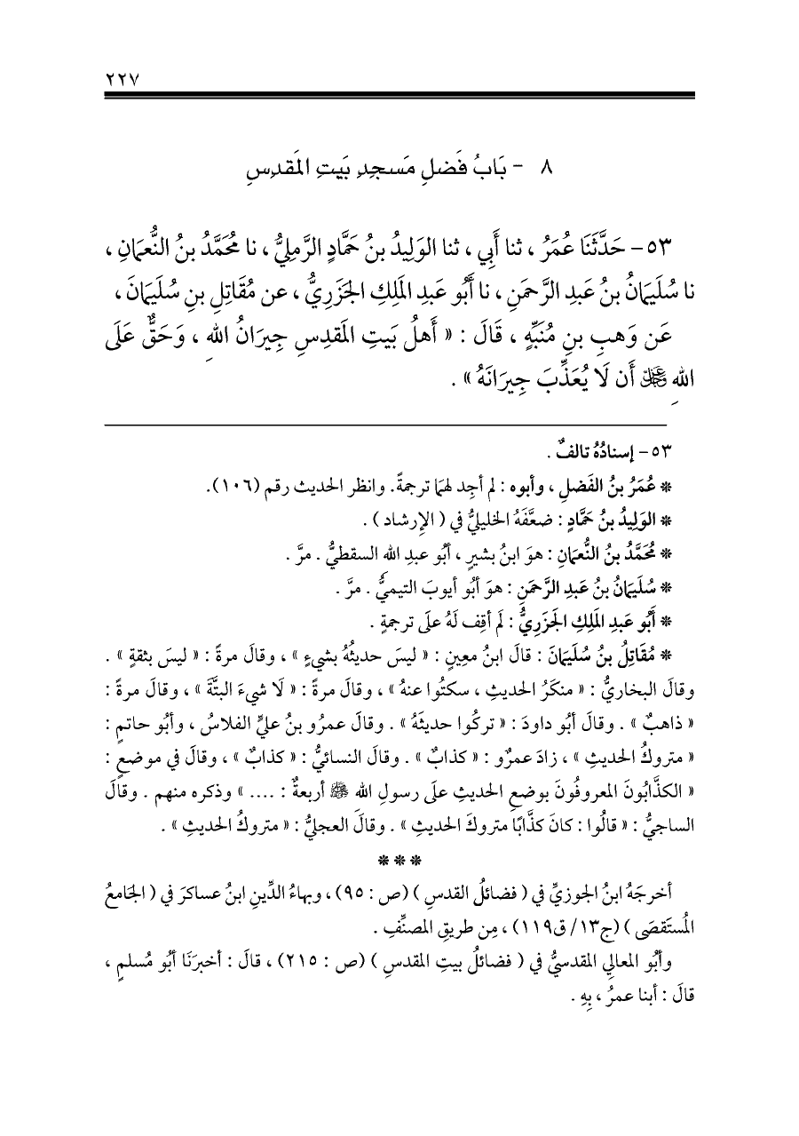 وأبُو المعالِي المقدسيُّ في (فضائلُ بيتِ المقدسِ) (ص: ٢١٥)، قالَ: أخبرَنَا أبُو مُسلمٍ، قالَ: أبنا عمرُ، بِهِ.