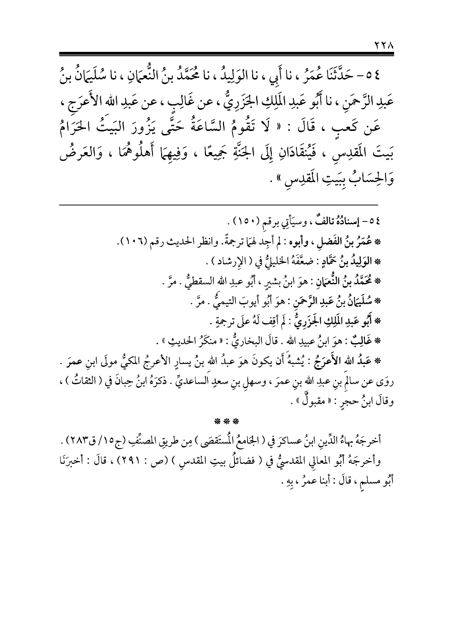 ٥٤ - حَدَّثَنَا عُمَرُ، نا أَبِي، نا الوَلِيدُ، نا مُحَمَّدُ بنُ النُّعمَانِ، نا سُلَيمَانُ بنُ عَبدِ الرَّحمَنِ، نا أَبُو عَبدِ المَلِكِ الجَزَرِيُّ، عن غَالِبٍ، عن عَبدِ اللهِ الأَعرَجِ،
