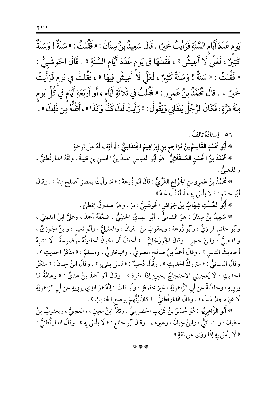 * سَعِيدُ بنُ سِنَانَ: هوَ الشاميُّ، أبُو مهديٍّ الحنفِيُّ. ضعَّفَهُ أحمدُ، وعليُّ ابنُ المدينيِّ، وأبُو حاتمٍ الرازيُّ، وأبُو زُرعَةَ، ويعقوبُ بنُ سفيانَ، والعقيليُّ، وأبُو نعيمٍ، وابنُ الجوزيِّ، والذهبيُّ، وابنُ حجرٍ. وقالَ الجُوْزْجَانِيُّ: «أخافُ أَن تكونَ أحاديثُهُ موضوعةً، لَا تشبِهُ أحاديثَ الناسِ». وقالَ أحمدُ بنُ صالحٍ المصريُّ، والبخاريُّ، ومسلمٌ: «منكَرُ الحديثِ». وقالَ النسائيُّ: «متروكُ الحديثِ». وقالَ دُحيمٌ: «ليسَ بشيءٍ». وقالَ ابنُ حِبانَ: «منكَرُ الحديثِ، لَا يُعجبنِي الاحتجاجُ بخبرِهِ إذَا انفردَ». وقالَ أبُو أحمدَ بنُ عديٍّ: «وعامَّةُ مَا يروِيهِ، وخاصَّةً عن أبِي الزَّاهريَّةِ، غيرُ محفوظٍ، ولَو قلتَ: إنَّهُ هوَ الذِي يروِيهِ عن أبِي الزاهريَّةِ لَا غيرُه جازَ ذلكَ». وقالَ الدارقُطنيُّ: «كانَ يُتَّهمُ بوضعِ الحديثِ».