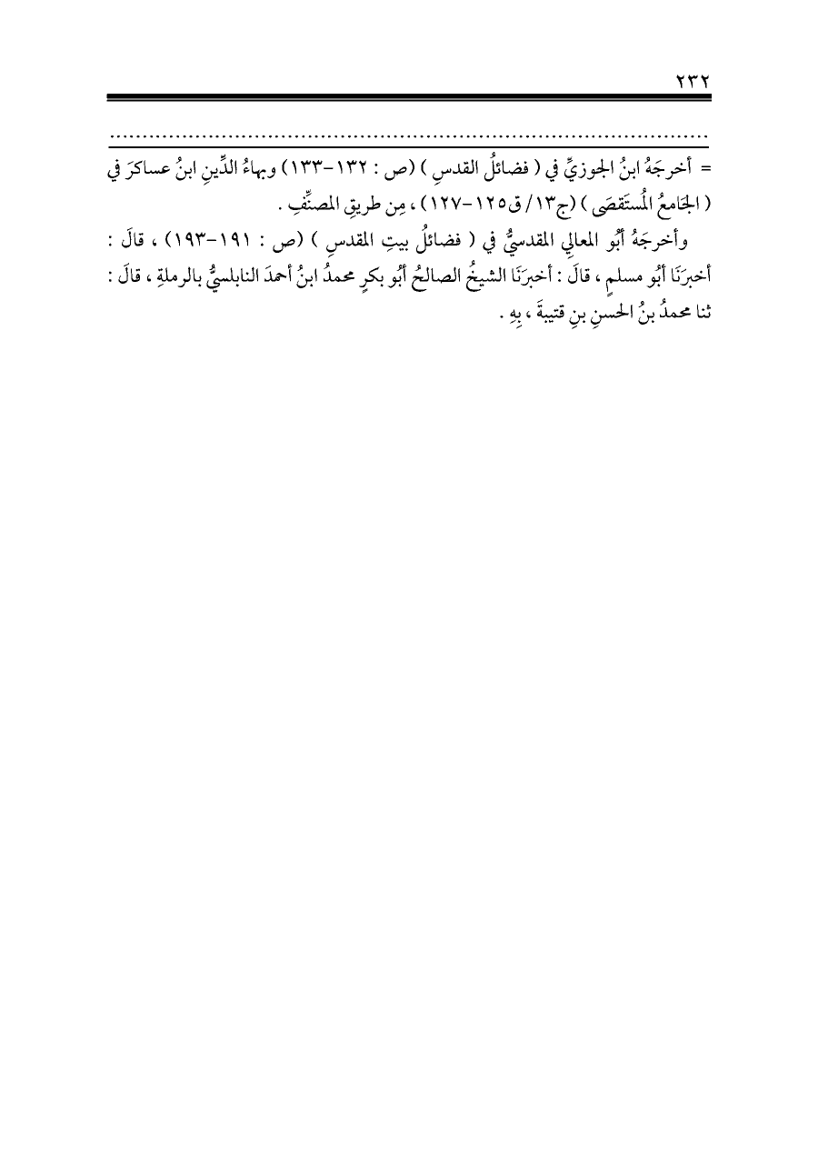 = أخرجَهُ ابنُ الجوزيِّ في (فضائلُ القدسِ) (ص: ١٣٢ - ١٣٣) وبهاءُ الدِّينِ ابنُ عساكرَ في (الجَامعُ المُستَقصَى) (ج ١٣/ق ١٢٥ - ١٢٧)، مِن طريقِ المصنِّفِ.