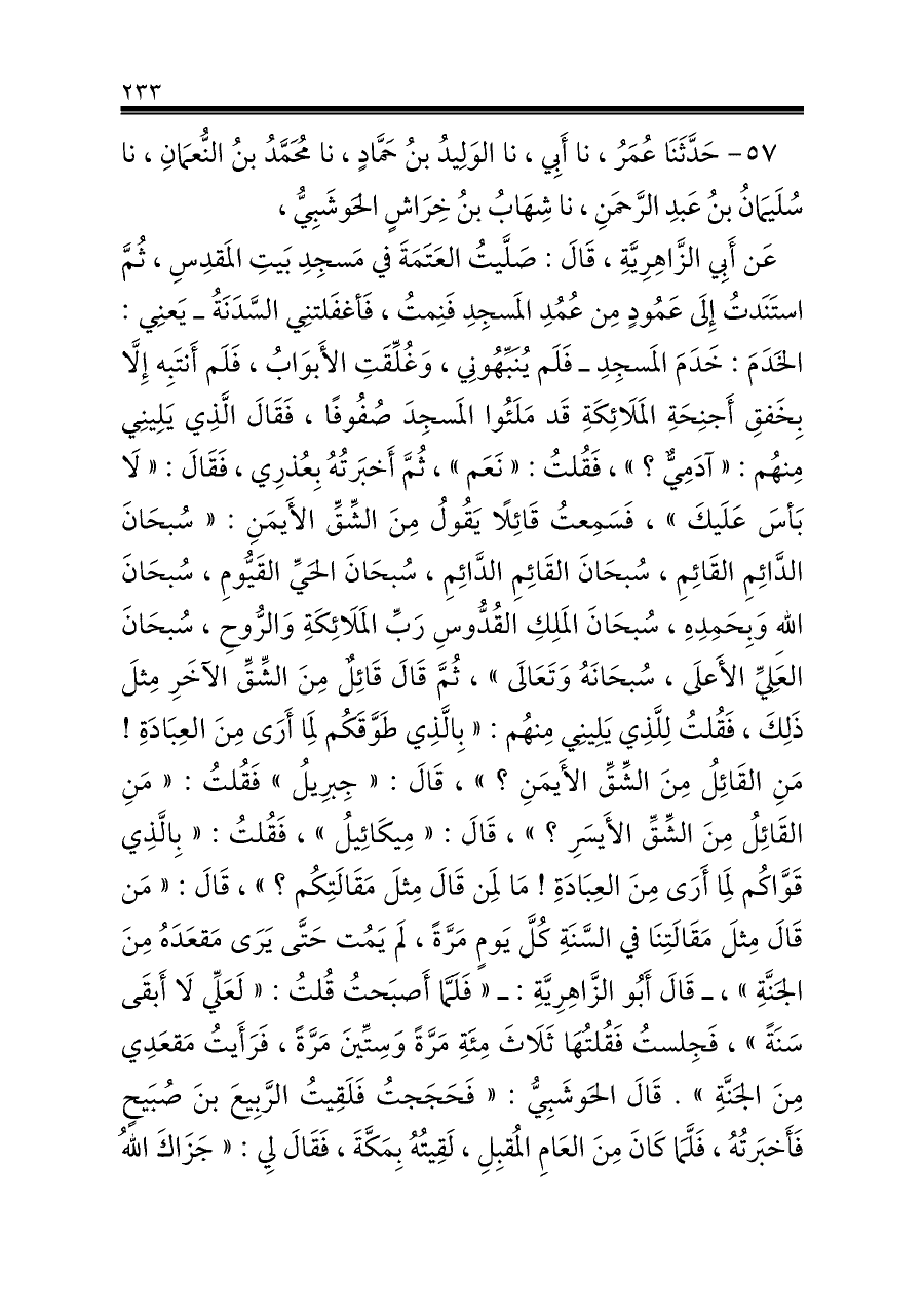 عَن أَبِي الزَّاهِرِيَّةِ، قَالَ: صَلَّيتُ العَتَمَةَ في مَسجِدِ بَيتِ المَقدِسِ، ثُمَّ استَنَدتُ إِلَى عَمُودٍ مِن عُمُدِ المَسجِدِ فَنِمتُ، فَأغفَلتنِي السَّدَنَةُ ـ يَعنِي: الخَدَمَ: خَدَمَ المَسجِدِ ـ فَلَم يُنَبِّهُونِي، وَغُلِّقَتِ الأَبوَابُ، فَلَم أَنتَبِه إِلَّا بِخَفقِ أَجنِحَةِ المَلَائِكَةِ قَد مَلَئُوا المَسجِدَ صُفُوفًا، فَقَالَ الَّذِي يَلِينِي مِنهُم: «آدَمِيٌّ؟»، فَقُلتُ: «نَعَم»، ثُمَّ أَخبَرتُهُ بِعُذرِي، فَقَالَ: «لَا بَأسَ عَلَيكَ»، فَسَمِعتُ قَائِلًا يَقُولُ مِنَ الشِّقِّ الأَيمَنِ: «سُبحَانَ الدَّائِمِ القَائِمِ، سُبحَانَ القَائِمِ الدَّائِمِ، سُبحَانَ الحَيِّ القَيُّومِ، سُبحَانَ اللهِ وَبِحَمِدِهِ، سُبحَانَ المَلِكِ القُدُّوسِ رَبِّ المَلَائِكَةِ وَالرُّوحِ، سُبحَانَ العَلِيِّ الأَعلَى، سُبحَانَهُ وَتَعَالَى»، ثُمَّ قَالَ قَائِلٌ مِنَ الشِّقِّ الآخَرِ مِثلَ ذَلِكَ، فَقُلتُ لِلَّذِي يَلِينِي مِنهُم: «بِالَّذِي طَوَّقَكُم لِمَا أَرَى مِنَ العِبَادَةِ! مَنِ القَائِلُ مِنَ الشِّقِّ الأَيمَنِ؟»، قَالَ: «جِبرِيلُ» فَقُلتُ: «مَنِ القَائِلُ مِنَ الشِّقِّ الأَيسَرِ؟»، قَالَ: «مِيكَائِيلُ»، فَقُلتُ: «بِالَّذِي قَوَّاكُم لِمَا أَرَى مِنَ العِبَادَةِ! مَا لِمَن قَالَ مِثلَ مَقَالَتِكُم؟»، قَالَ: «مَن قَالَ مِثلَ مَقَالَتِنَا في السَّنَةِ كُلَّ يَومٍ مَرَّةً، لَم يَمُت حَتَّى يَرَى مَقعَدَهُ مِنَ الجَنَّةِ»، ـ قَالَ أَبُو الزَّاهِرِيَّةِ: ـ «فَلَمَّا أَصبَحتُ قُلتُ: «لَعَلِّي لَا أَبقَى سَنَةً»، فَجِلستُ فَقُلتُهَا ثَلَاثَ