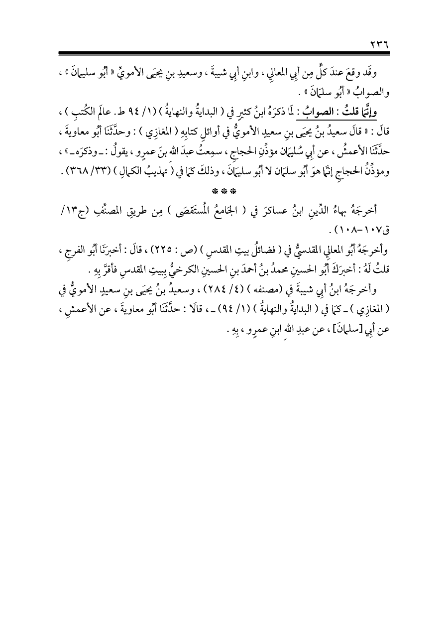 وإنَّمَا قلتُ: الصوابُ: لمَا ذكرَهُ ابنُ كثيرٍ في (البدايةُ والنهايةُ) (١/ ٩٤ ط. عالَم الكُتبِ)، قالَ: «قالَ سعيدُ بنُ يحيَى بنِ سعيدٍ الأمويُّ في أوائلِ كتابِهِ (المغازِي): وحدَّثَنَا أبُو معاويةَ، حدَّثَنَا الأعمشُ، عن أبِي سُليمَان مؤذِّنِ الحجاجِ، سمِعتُ عبدَ اللهِ بنَ عمرٍو، يقولُ: ـ وذكرَه ـ»، ومؤذِّنُ الحجاجِ إنمَّا هوَ أبُو سلمَان لا أبُو سليمَانَ، وذلكَ كمَا في (تهذيبُ الكمالِ) (٣٣/ ٣٦٨).