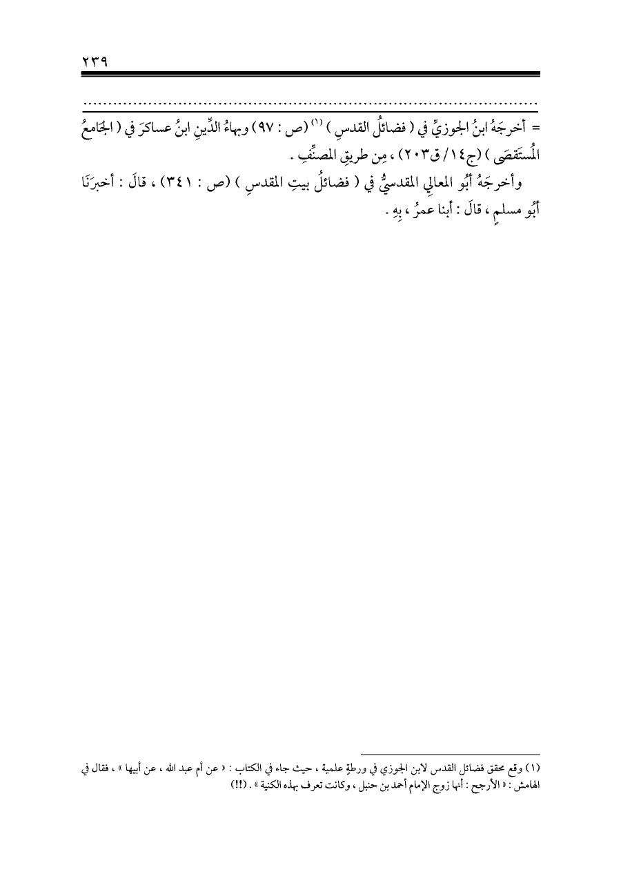(¬١) وقع محقق فضائل القدس لابن الجوزي في ورطةٍ علمية، حيث جاء في الكتاب: «عن أم عبد الله، عن أبيها»، فقال في الهامش: «الأرجح: أنها زوج الإمام أحمد بن حنبل، وكانت تعرف بهذه الكنية». (!!)