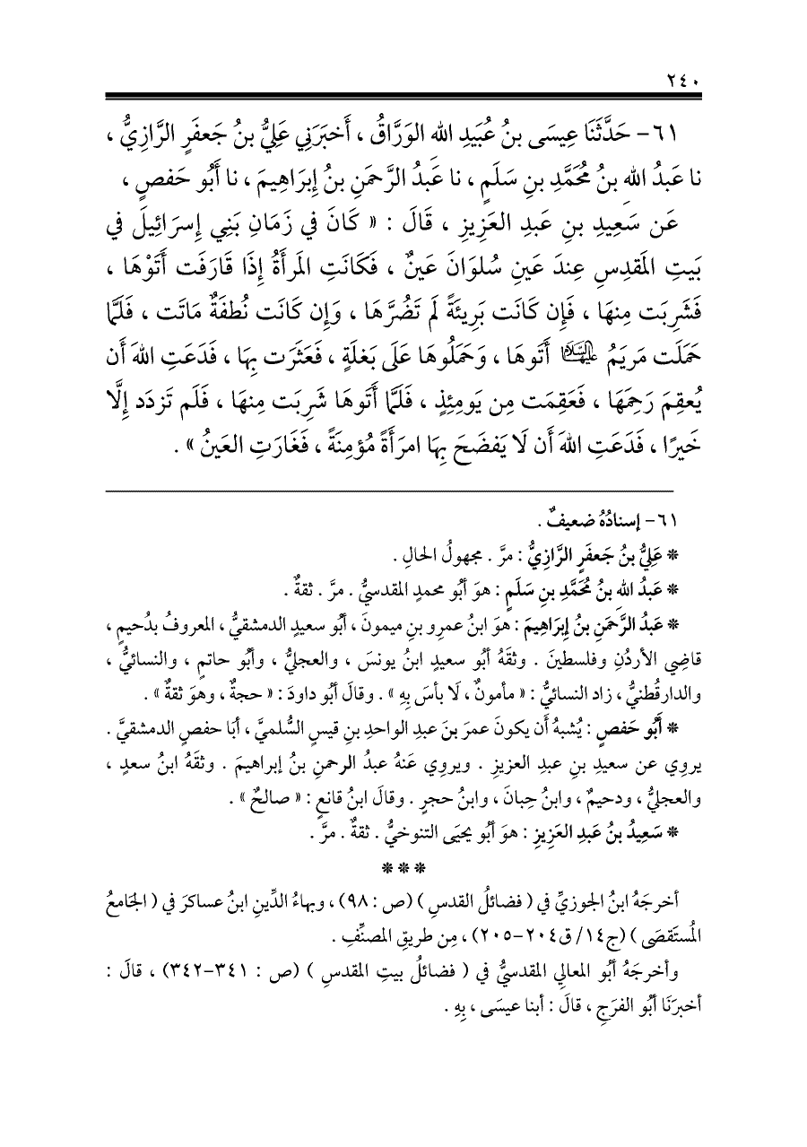وأخرجَهُ أبُو المعالِي المقدسيُّ في (فضائلُ بيتِ المقدسِ) (ص: ٣٤١ - ٣٤٢)، قالَ: أخبرَنَا أبُو الفرَجِ، قالَ: أبنا عيسَى، بِهِ.