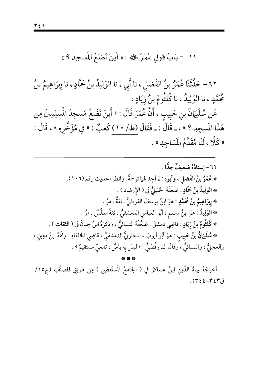 عَن سُلَيمَانَ بنِ حَبِيبٍ، أَنَّ عُمَرَ قَالَ: «أَينَ نَضَعُ مَسجِدَ المُسلِمِينَ مِن هَذَا المَسجِدِ؟»، ـ قَالَ: ـ فَقَالَ (ظ/١٠) كَعبٌ: «في مُؤَخَّرِهِ»، قَالَ: «كَلَّا، لَنَا مُقَدَّمُ المَسَاجِدِ».