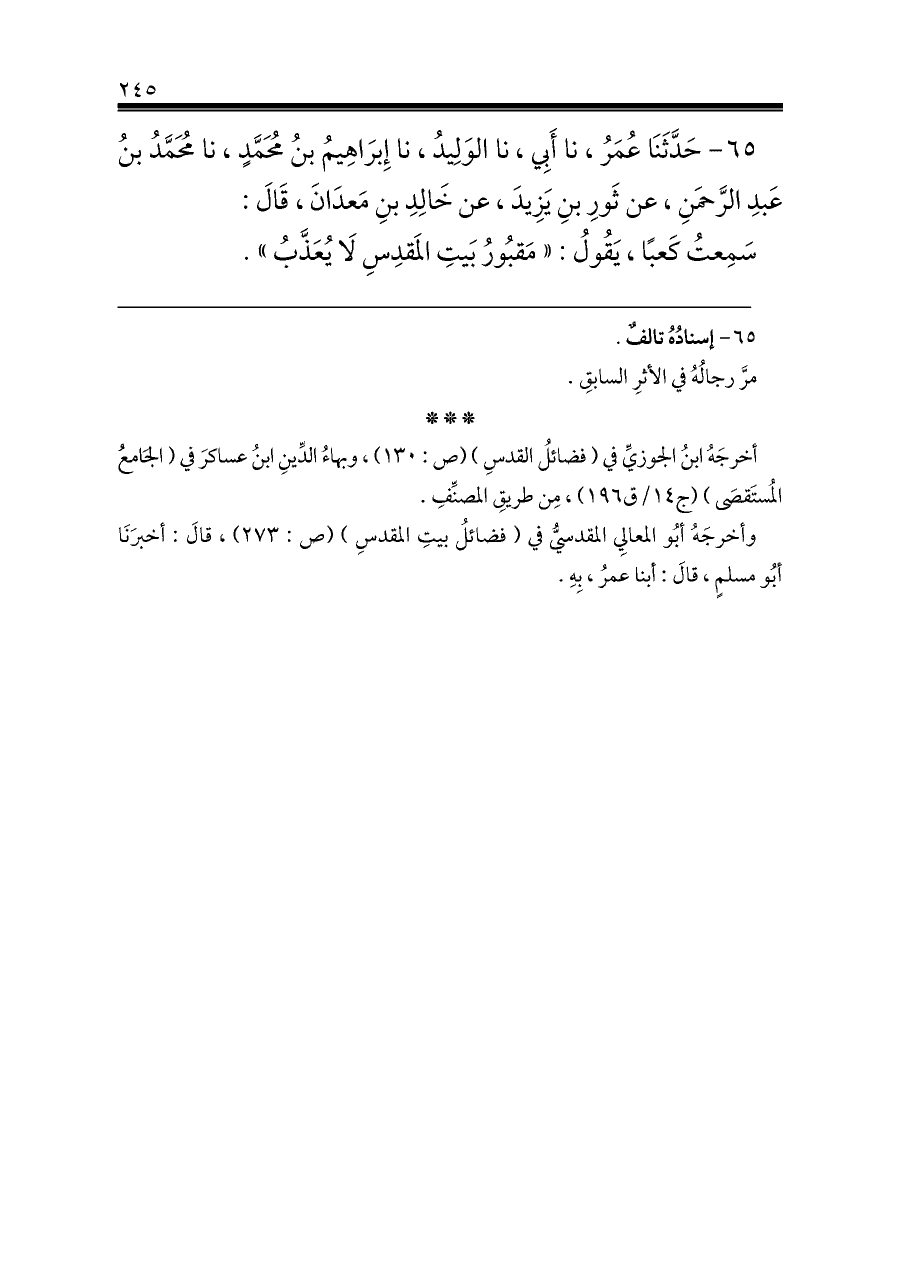 وأخرجَهُ أبُو المعالِي المقدسيُّ في (فضائلُ بيتِ المقدسِ) (ص: ٢٧٣)، قالَ: أخبرَنَا أبُو مسلمٍ، قالَ: أبنا عمرُ، بِهِ.