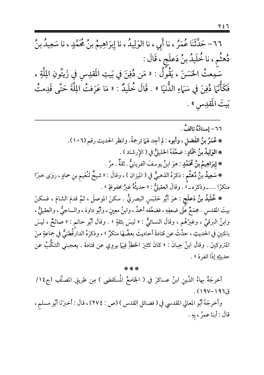 وأخرجَهُ أبُو المعالي المقدسي في (فضائل القدس) (ص: ٢٧٤)، قالَ: أخبرَنَا أبُو مسلمٍ، قالَ: أبنا عمرُ، بِهِ.