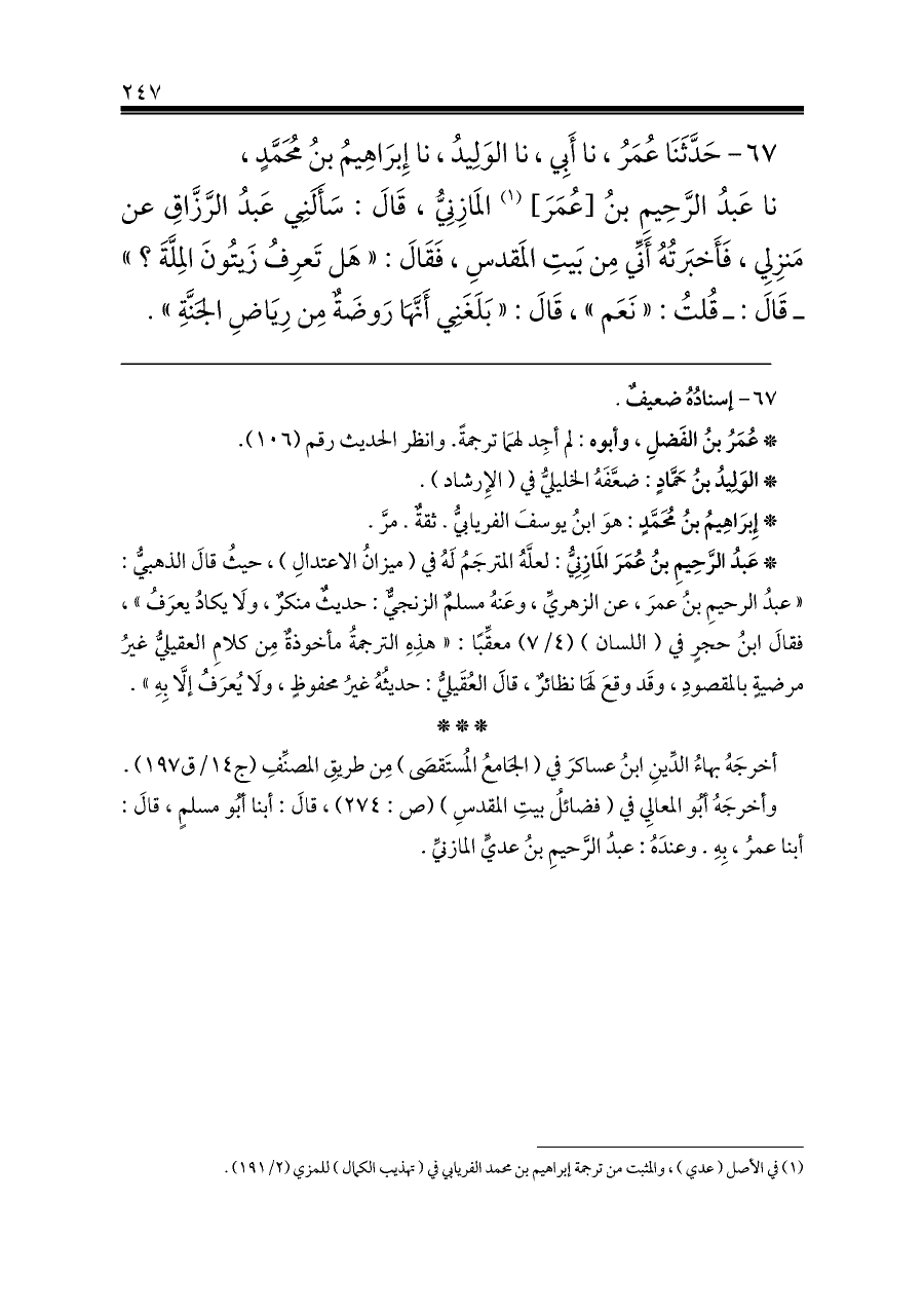 وأخرجَهُ أبُو المعالِي في (فضائلُ بيتِ المقدسِ) (ص: ٢٧٤)، قالَ: أبنا أبُو مسلمٍ، قالَ: أبنا عمرُ، بِهِ. وعندَهُ: عبدُ الرَّحيمِ بنُ عديٍّ المازنيِّ.